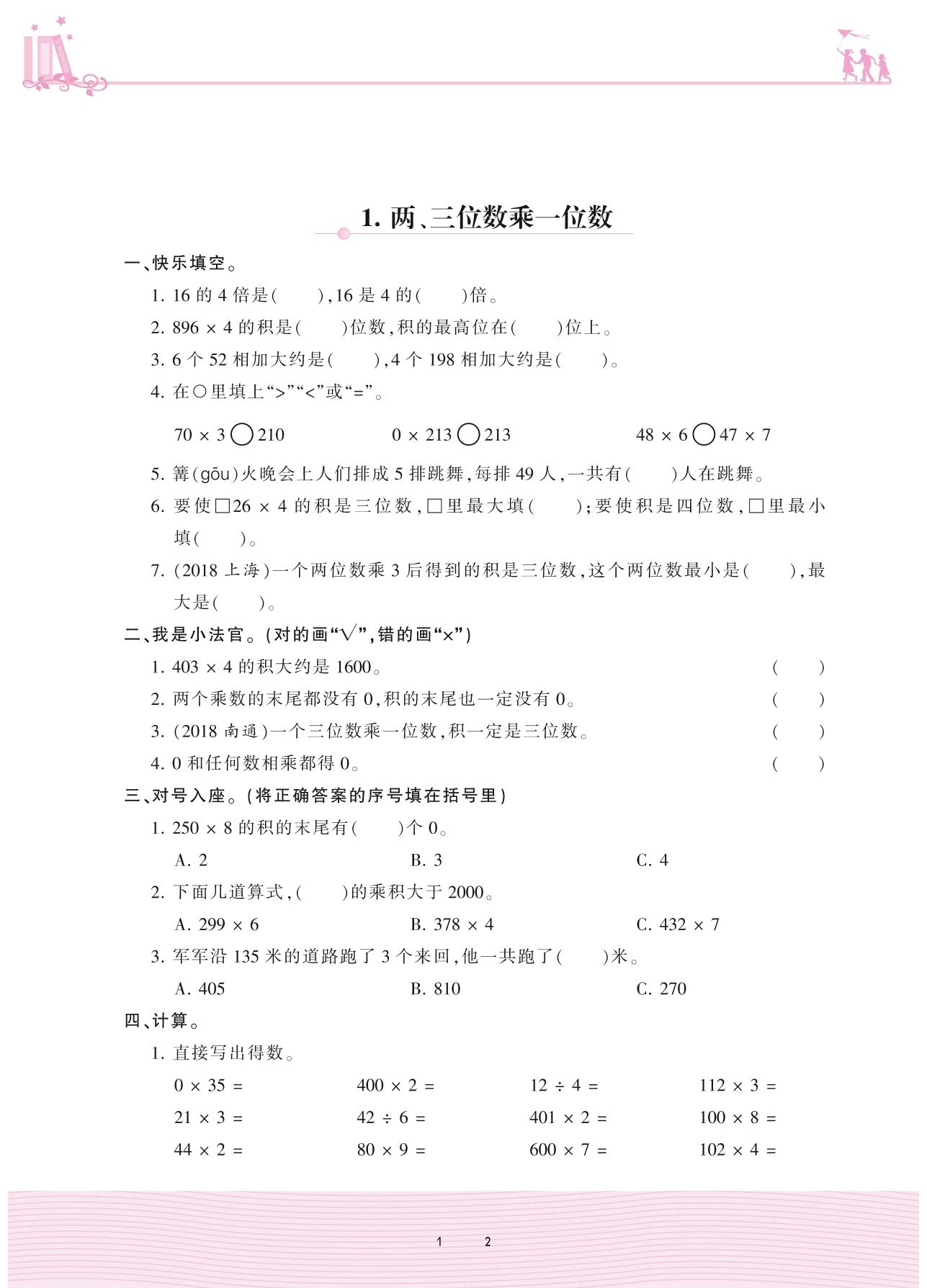 2020上册三年级数学苏教版 八 期末复习——1. 两、三位数乘一位数