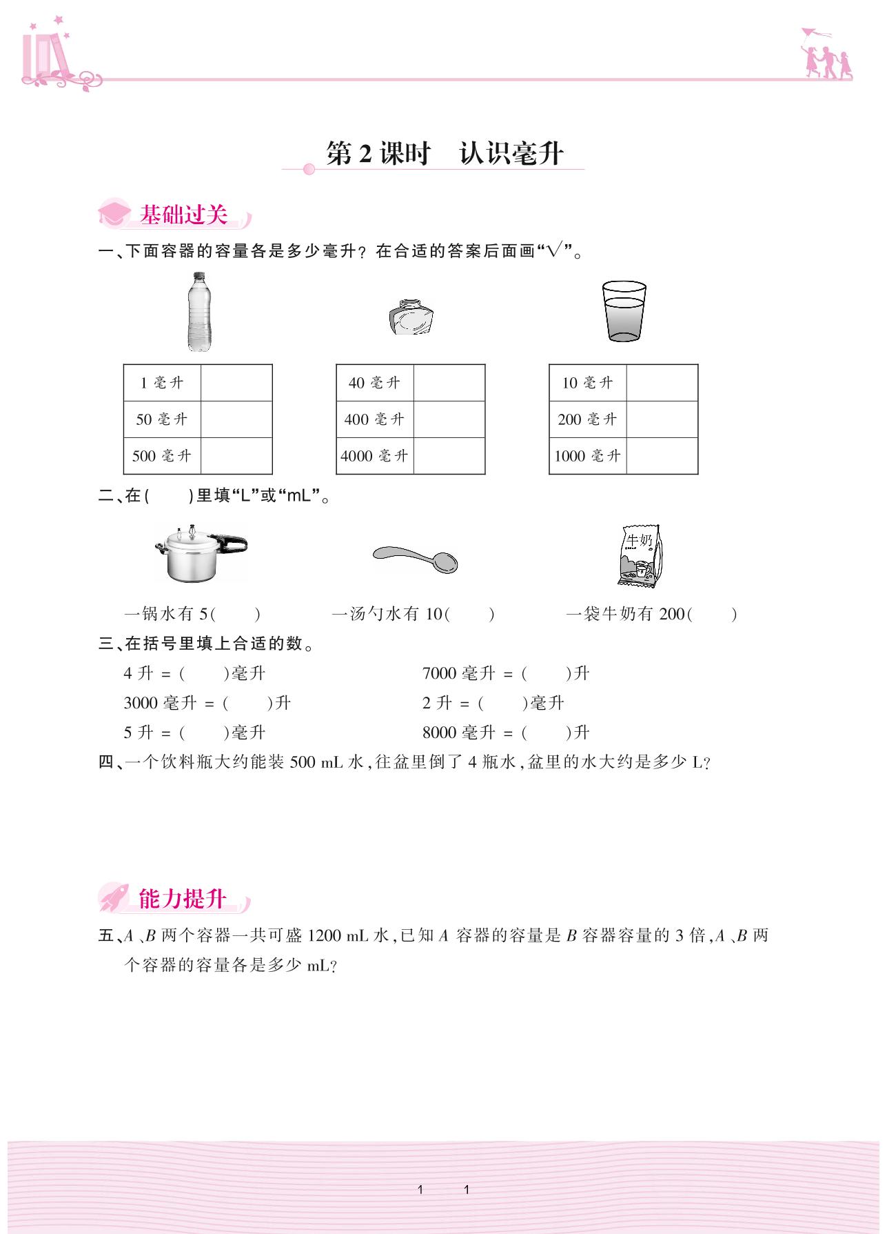 2020上册四年级数学苏教版 一 升和毫升——第2课时 认识毫升