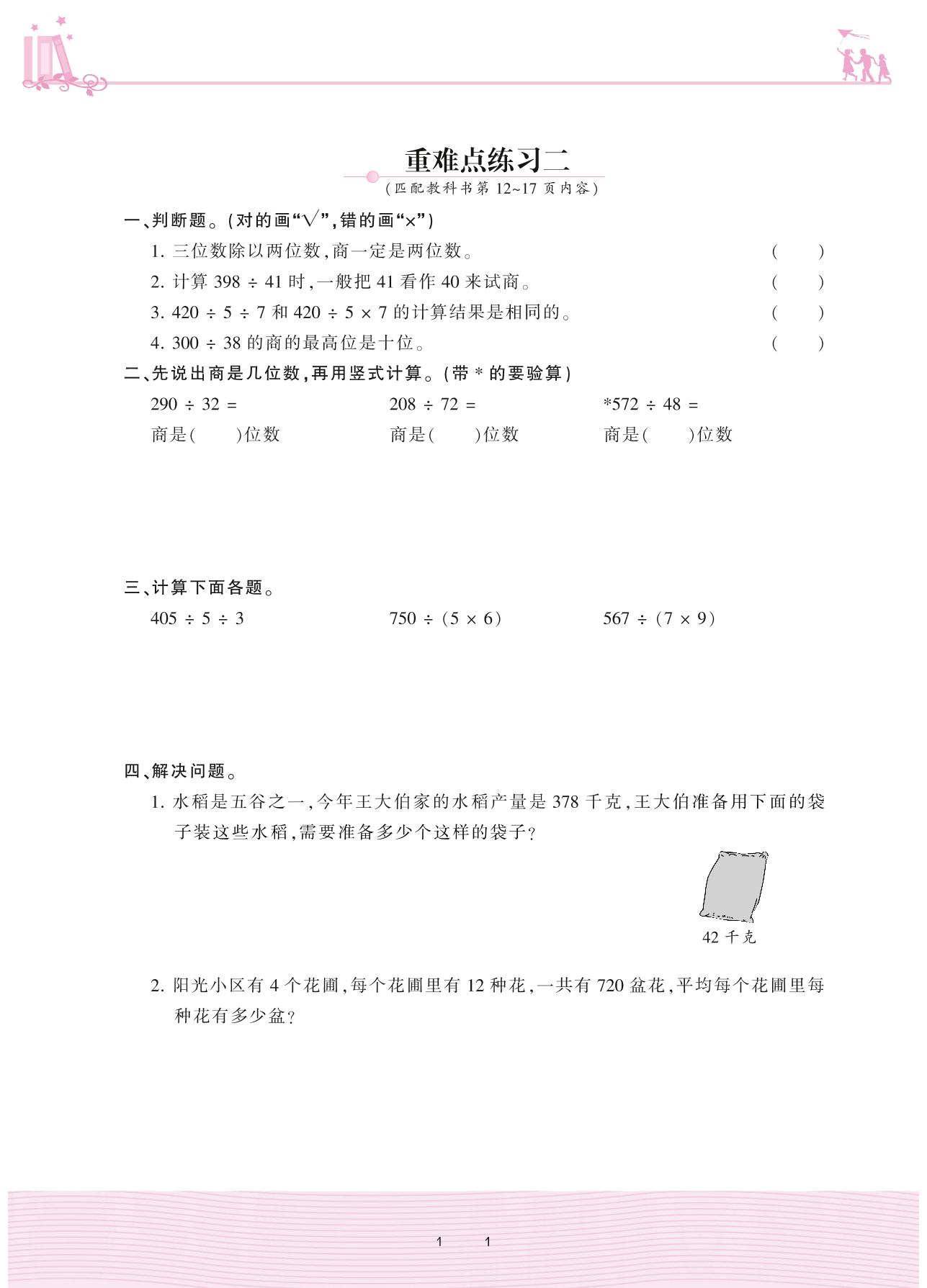 2020上册四年级数学苏教版 二 两、三位数除以两位数——重难点练习二