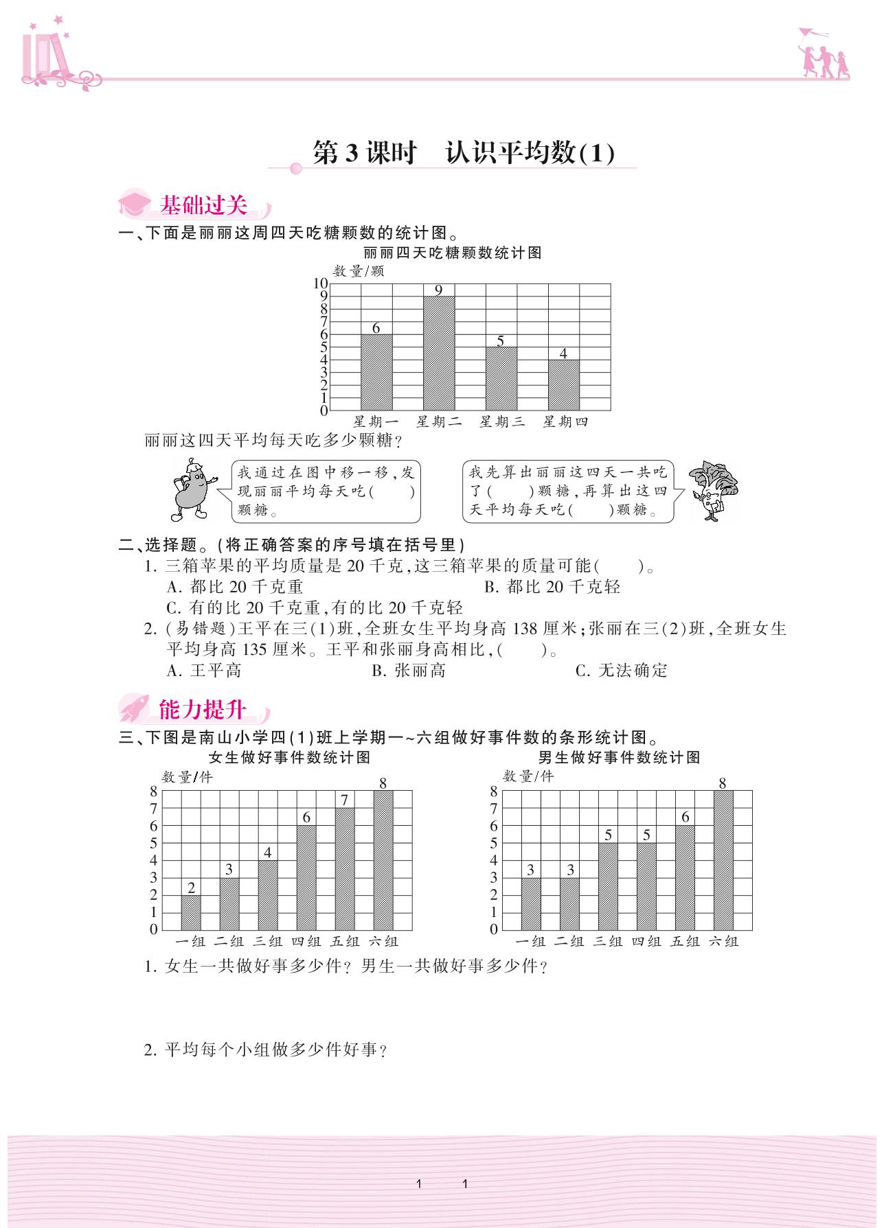 2020上册四年级数学苏教版 四 统计表和条形统计图(一)——第3课时 认识平均数(1)
