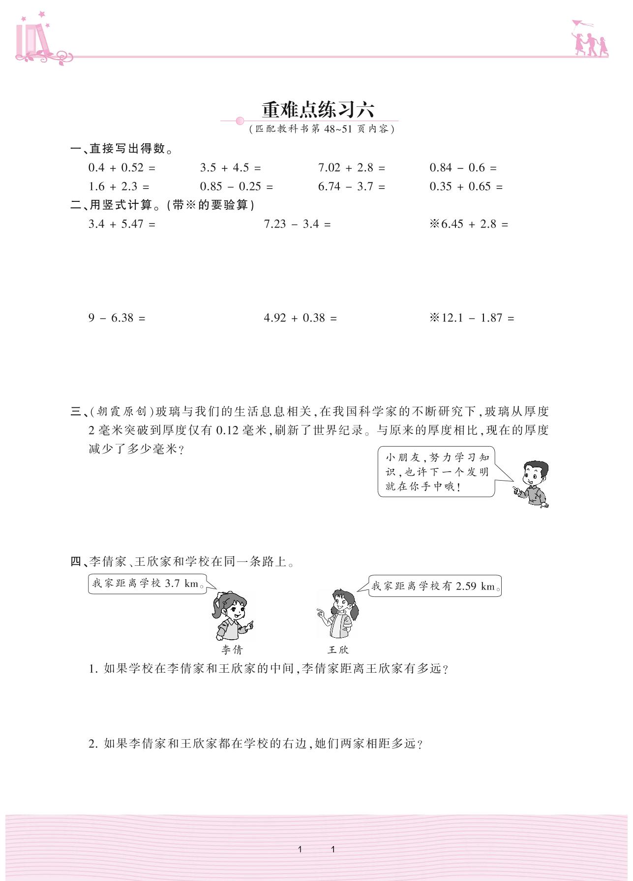 2020上册五年级数学苏教版 四 小数加法和减法——重难点练习六
