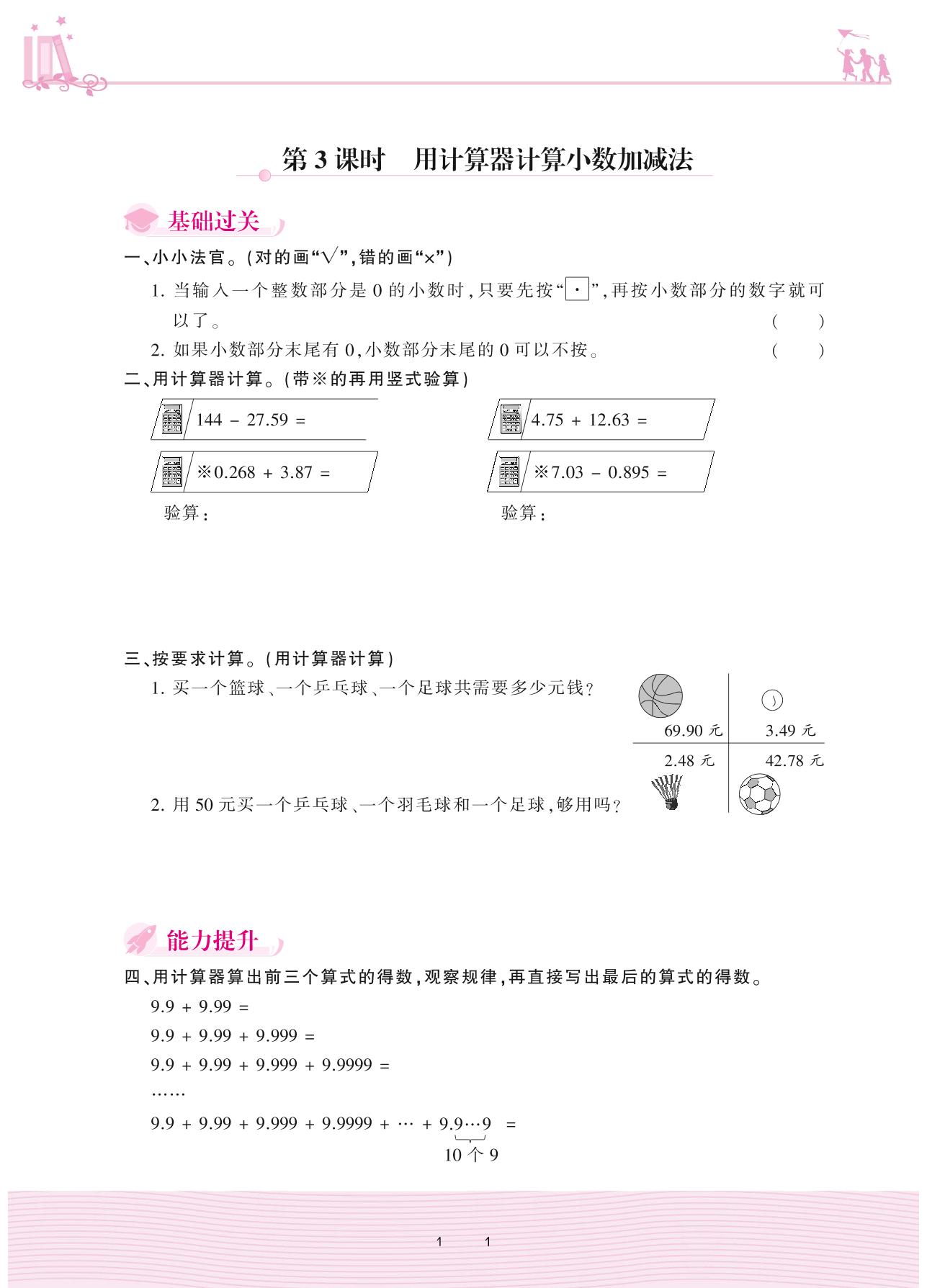 2020上册五年级数学苏教版 四 小数加法和减法——第3课时 用计算器计算小数加减法