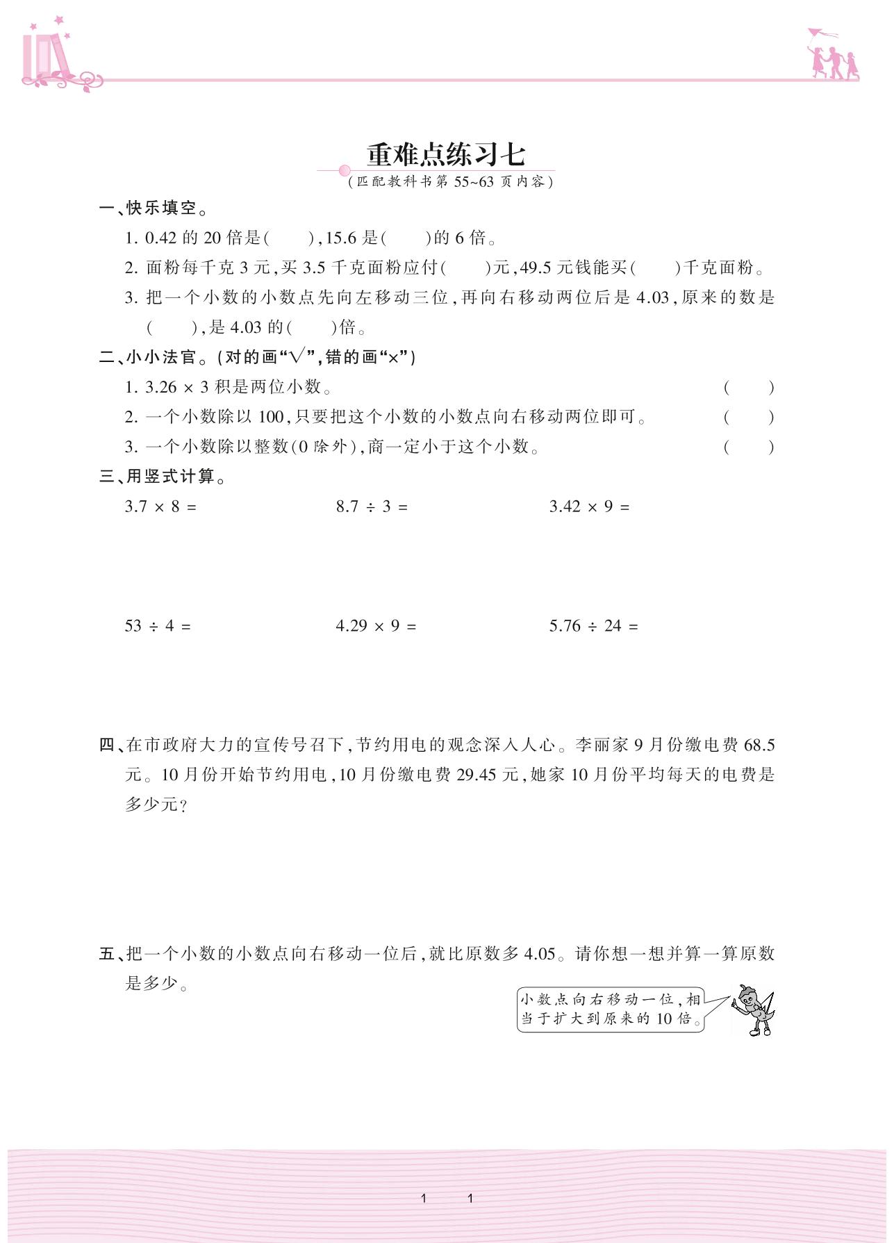 2020上册五年级数学苏教版 五 小数乘法和除法——重难点练习七