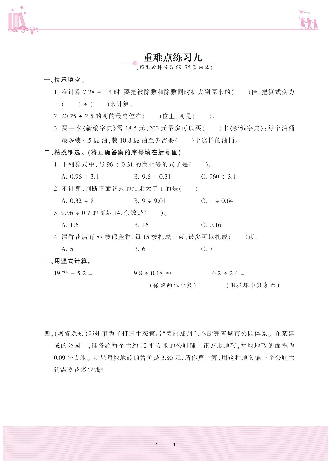 2020上册五年级数学苏教版 五 小数乘法和除法——重难点练习九