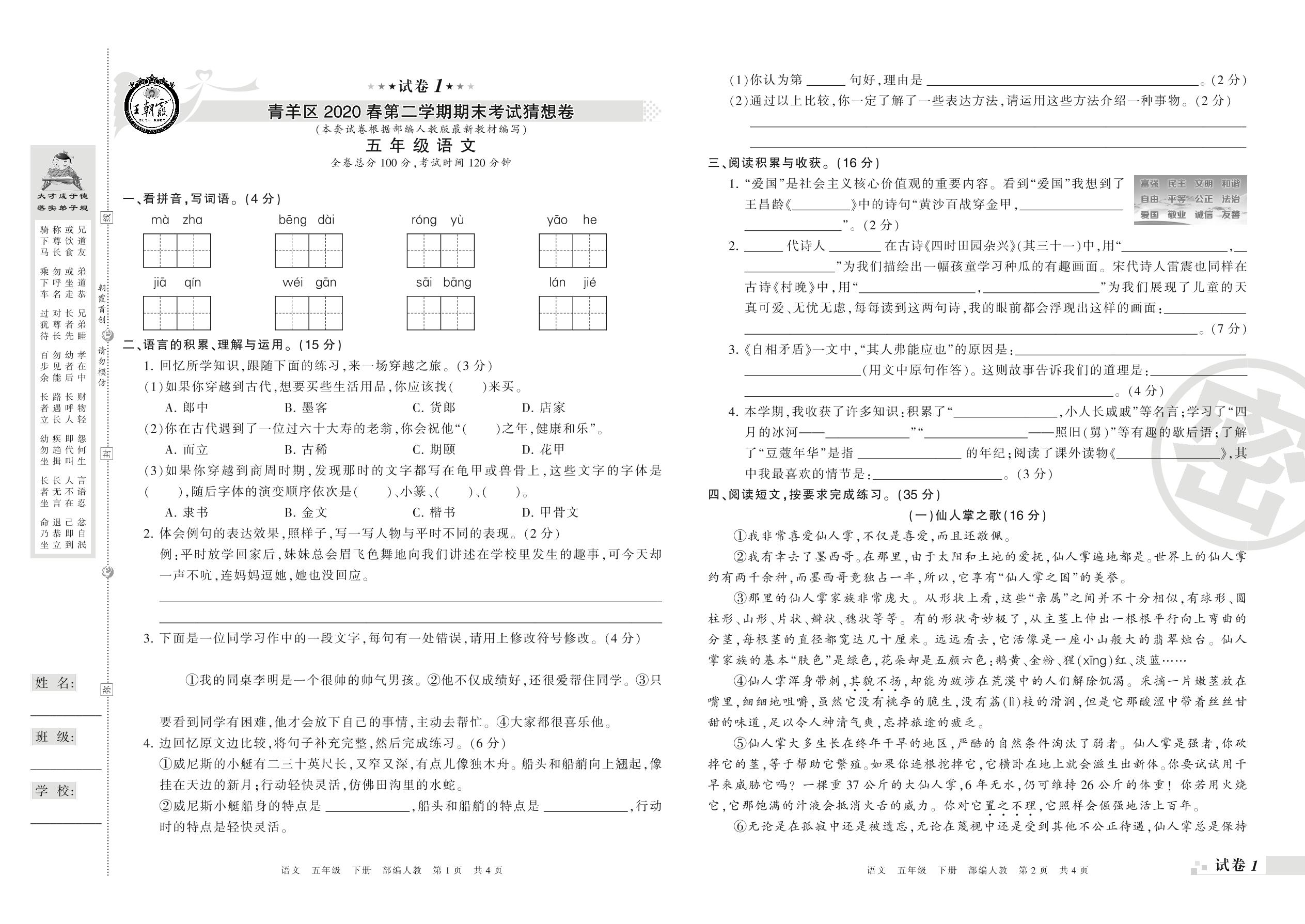 2018-2019学年第二学期成都市青羊区猜想卷五年级语文试卷(人教版)【1】