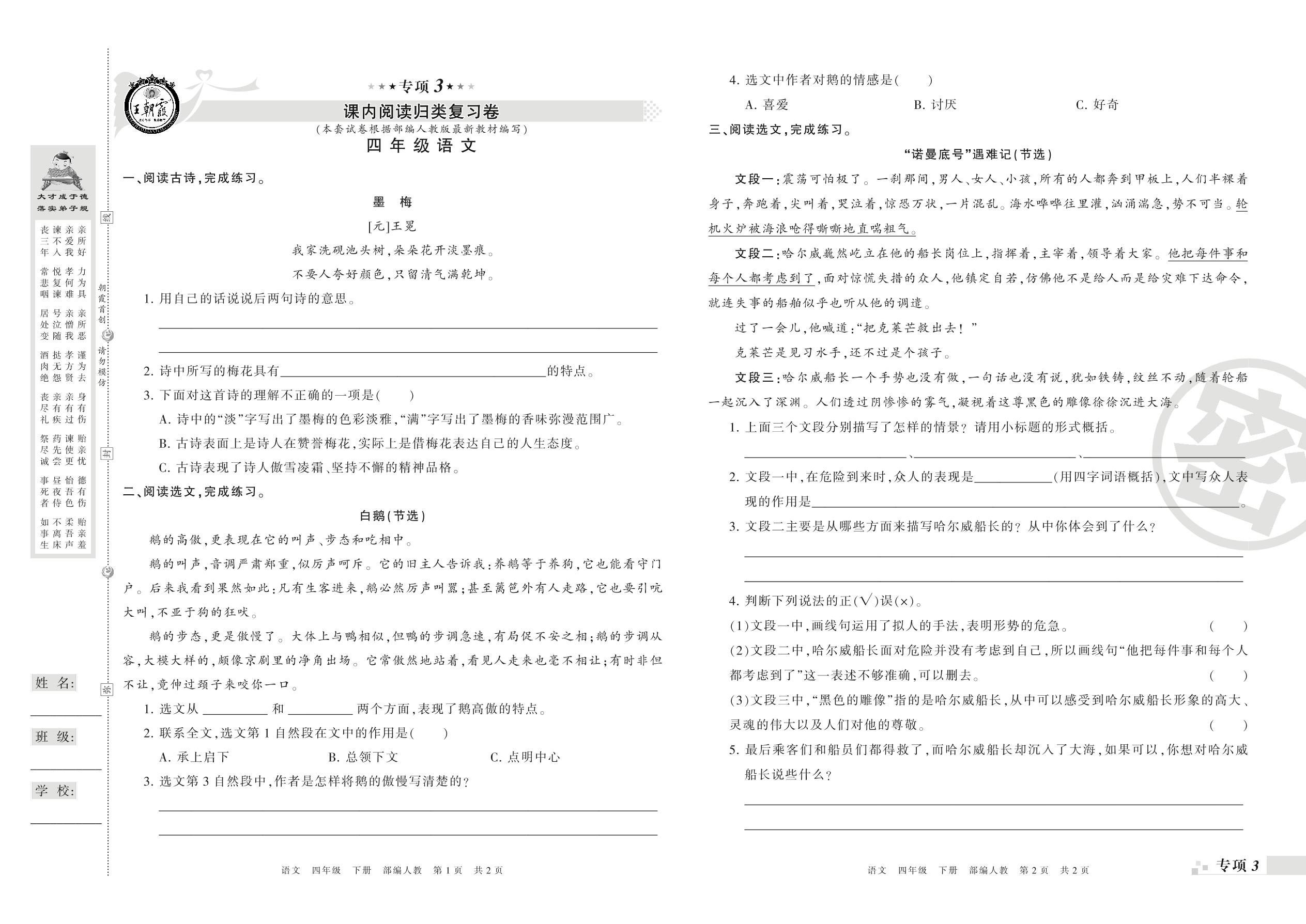 王朝霞期末专项卷——课内阅读、课外阅读真题归类复习卷四年级下册语文(人教版)_R210801192411【0】