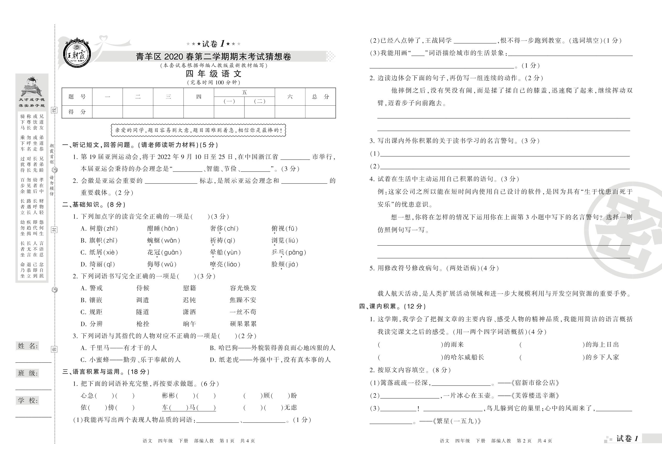 2018-2019学年第二学期成都市青羊区猜想卷四年级语文试卷(人教版)【1】
