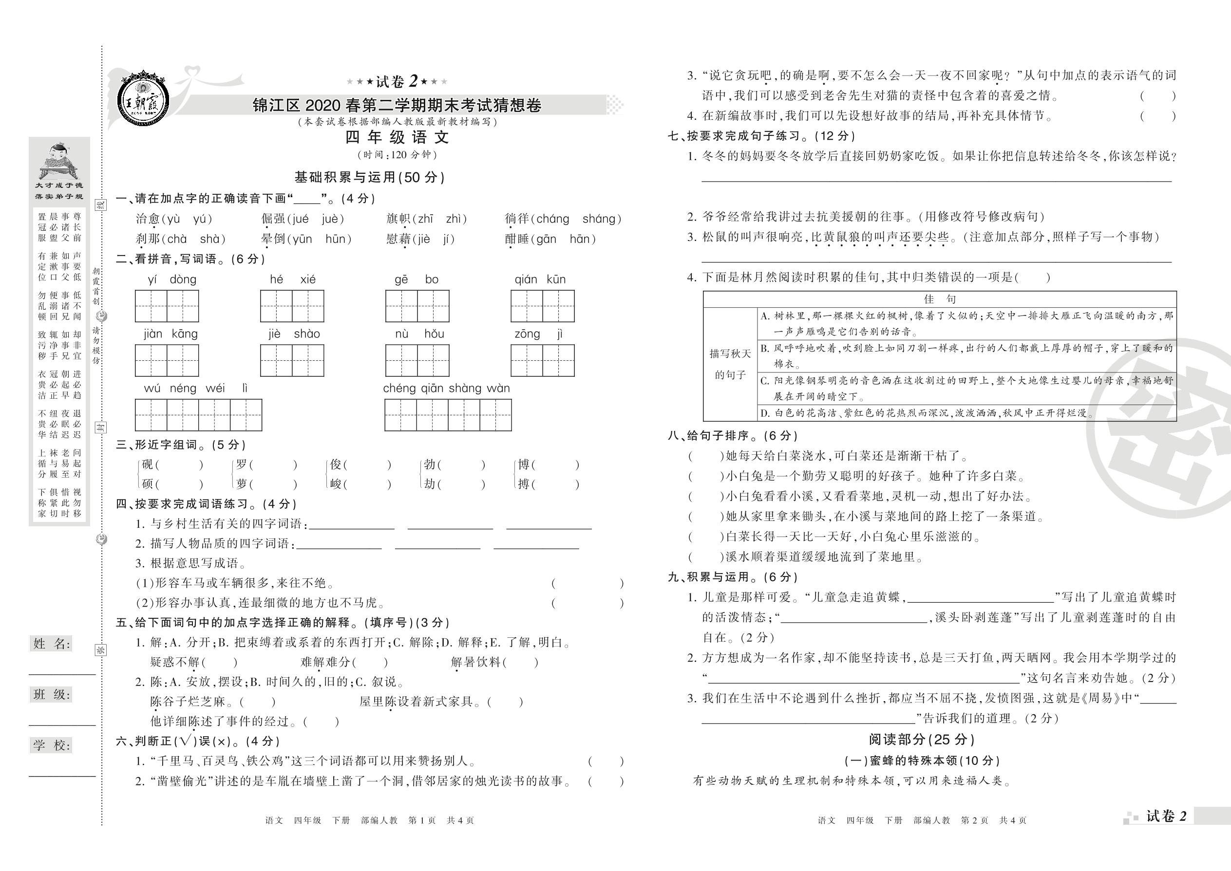 2018-2019学年第二学期成都市锦江区猜想卷四年级语文试卷(人教版)【2】