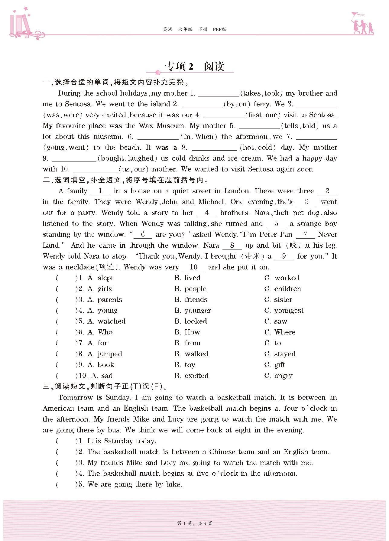 2021下册六年级英语PEP版 Recycle—专项2 阅读