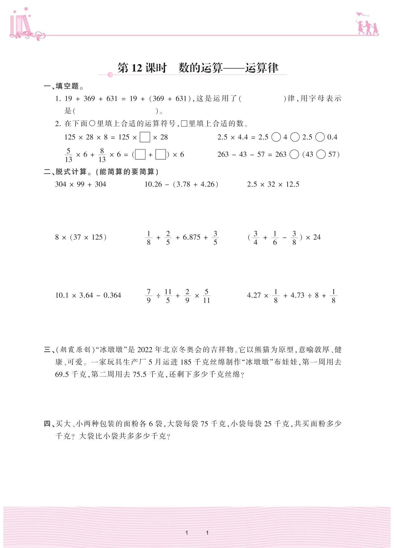 2021下册六年级数学北师版 总复习 1. 数与代数——第12课时 数的运算——运算律