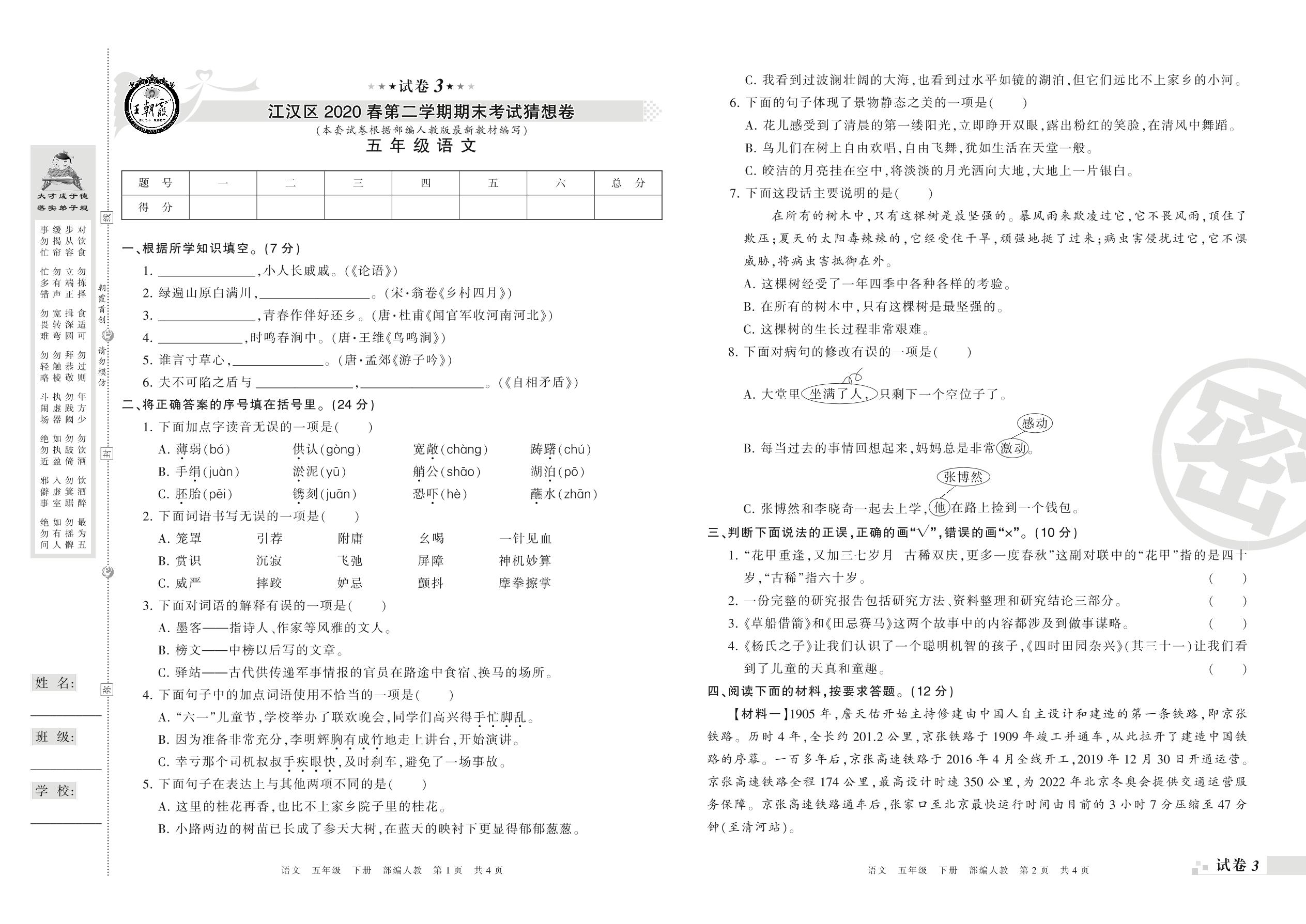2018-2019学年第二学期武汉市江汉区猜想卷五年级语文试卷(人教版)【3】