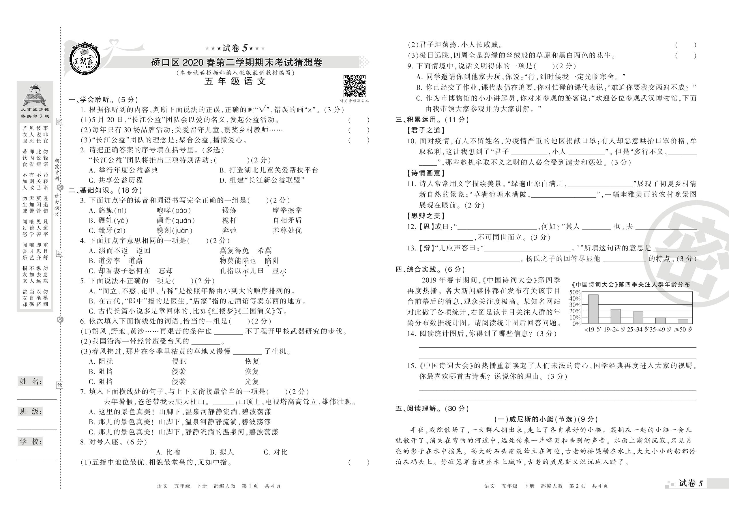 2018-2019学年第二学期武汉市硚口区猜想卷五年级语文试卷(人教版)【5】