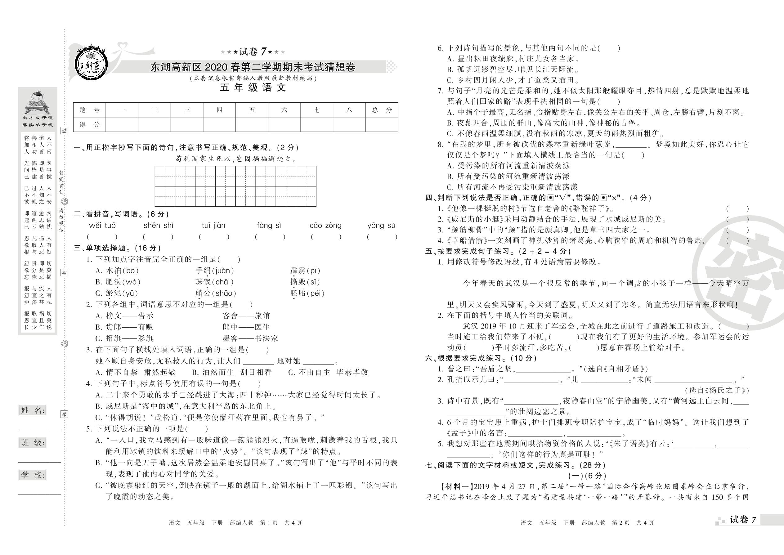 2018-2019学年第二学期武汉市东湖高新区猜想卷五年级语文试卷(人教版)【7】