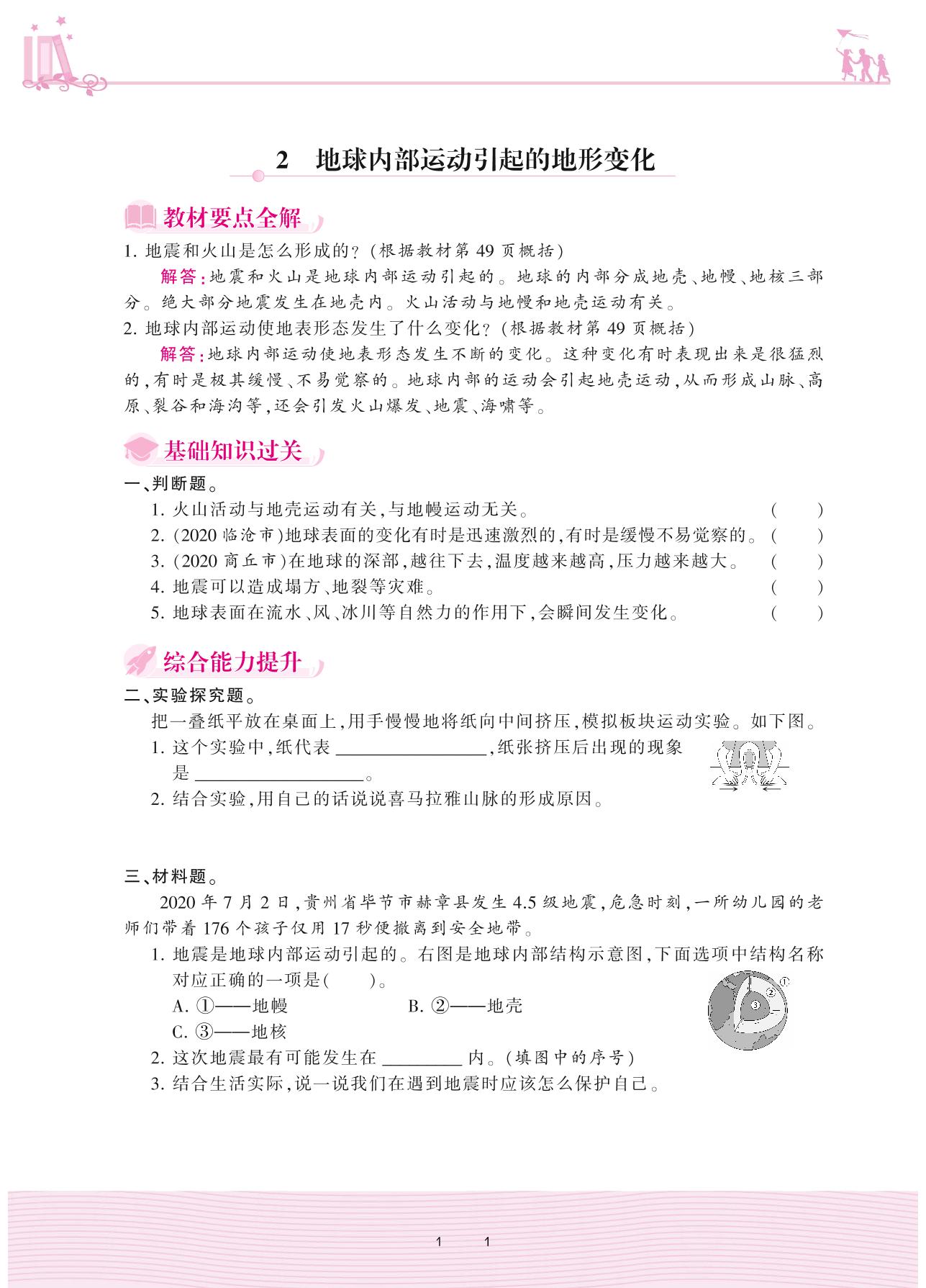 2020上册五年级科学教科版 第三单元 地球表面及其变化——2 地球内部运动引起的地形变化