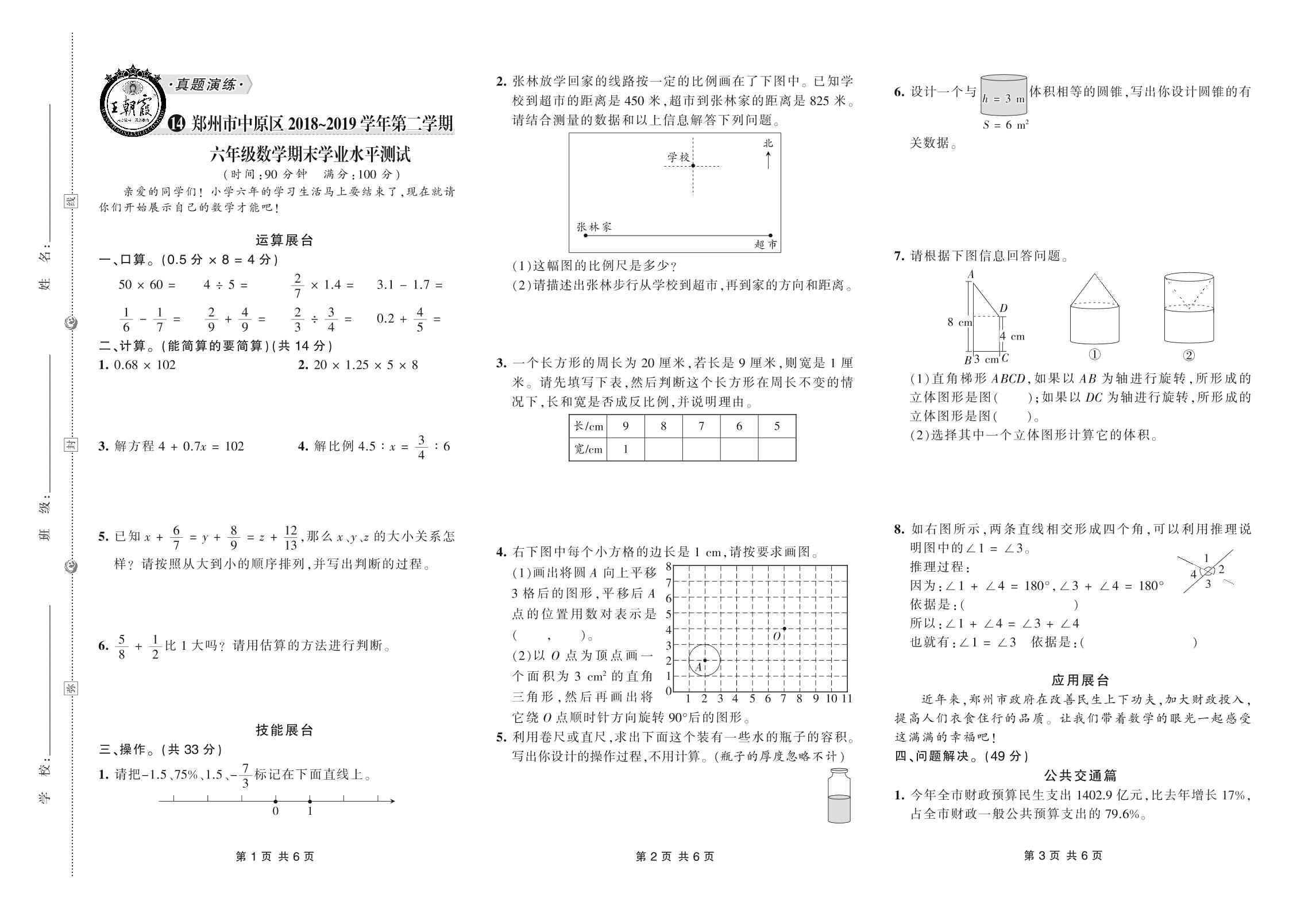 小升初数学郑州市中原区2018~2019学年第二学期六年级数学期末学业水平测试【14】