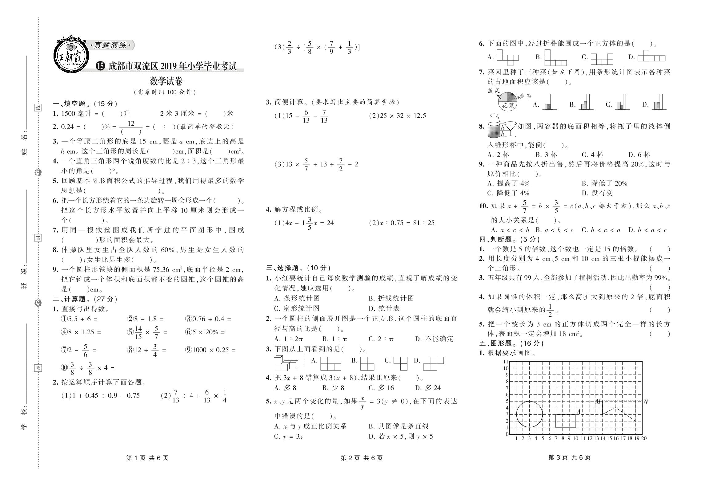 小升初数学成都市双流区2019年小学毕业考试数学试卷【15】