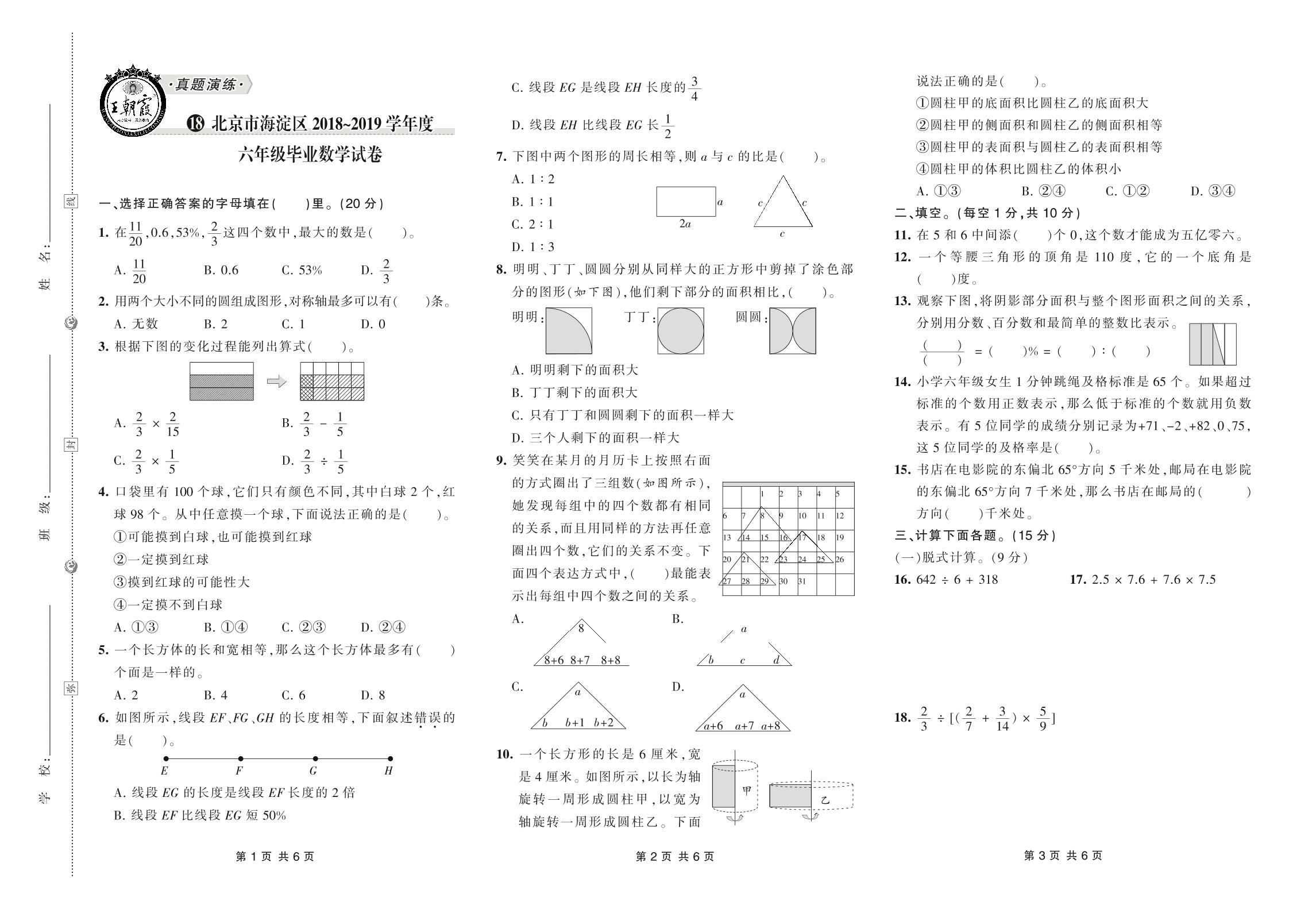 小升初数学北京市海淀区2018~2019学年度六年级毕业数学试卷【18】