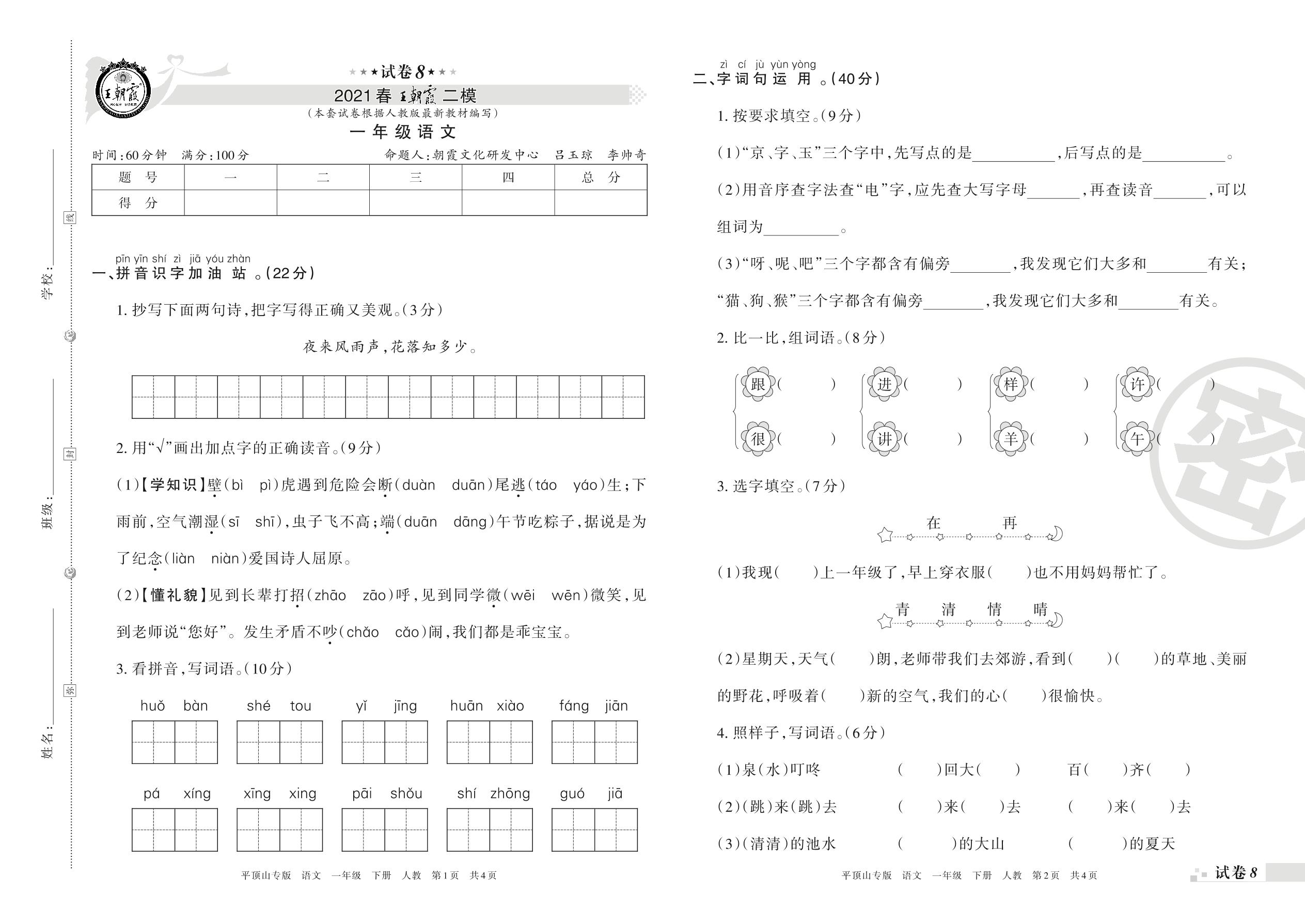 王朝霞期末模拟卷一年级下册语文(人教版)_R210731172905【8】