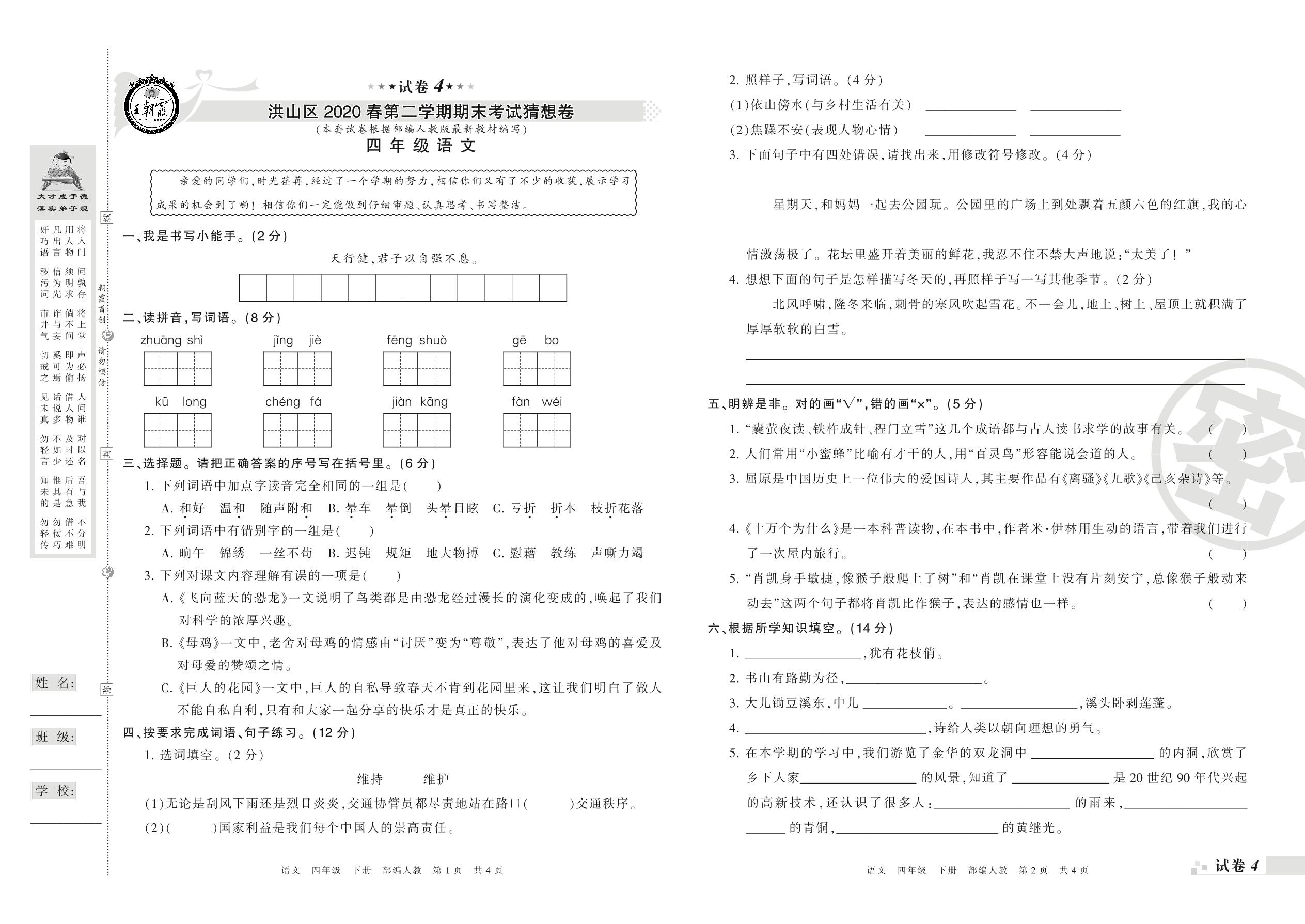 2018-2019学年第二学期武汉市洪山区猜想卷四年级语文试卷(人教版)【4】