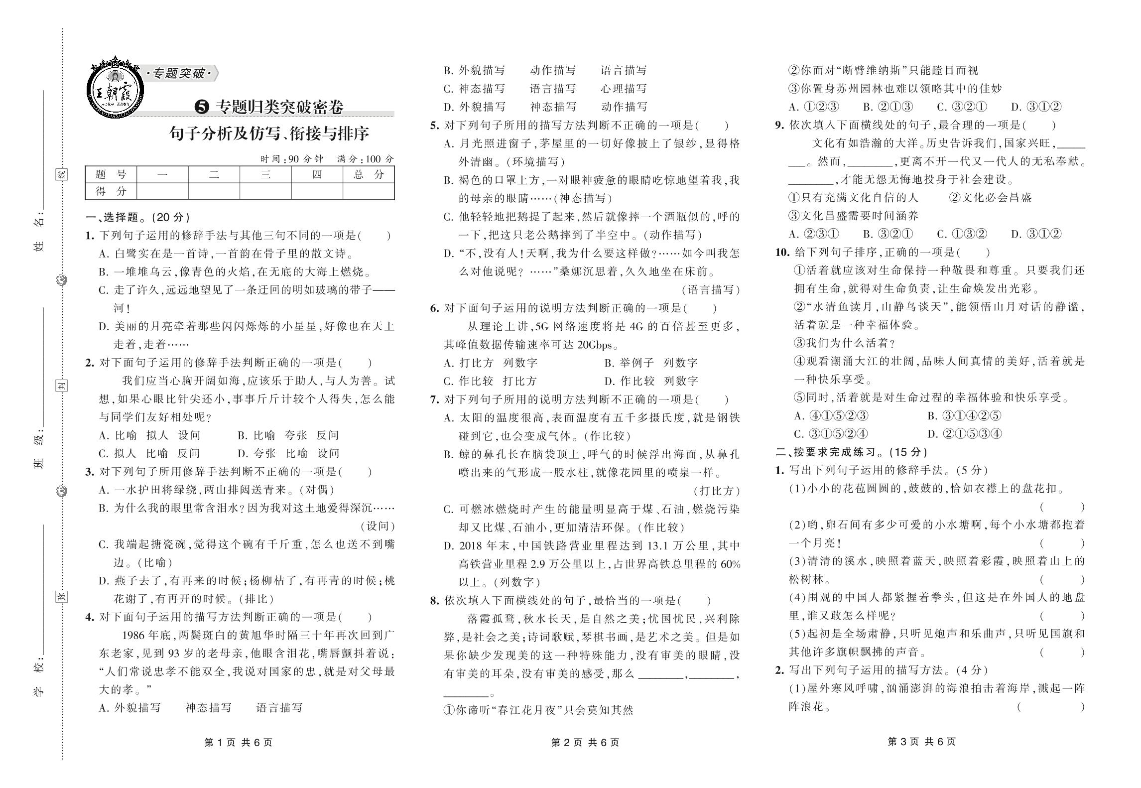 小升初语文·王朝霞专题归类突破密卷——句子分析及仿写、衔接与病句修改【5】