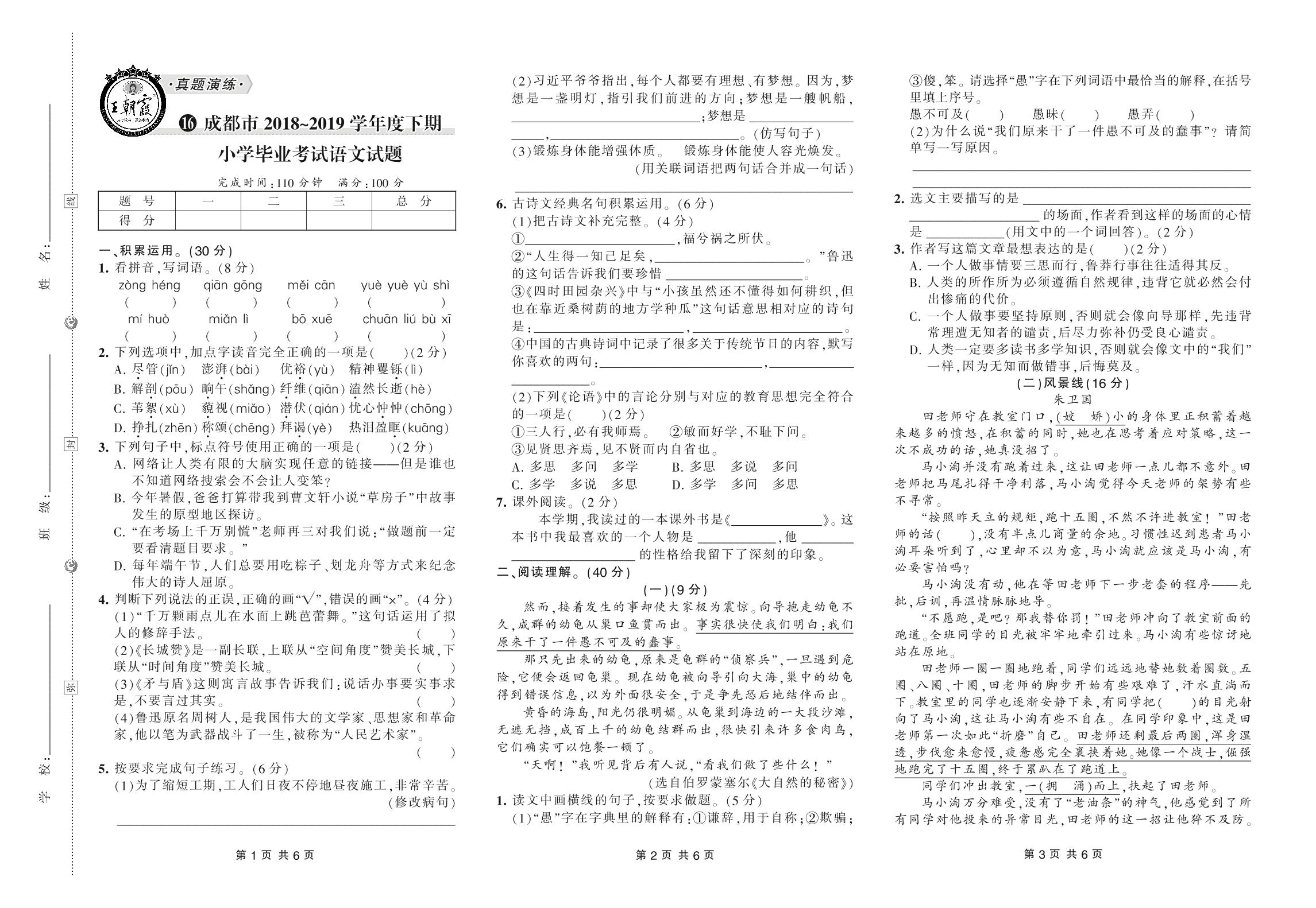 小升初语文成都市2018~2019学年度下期小学毕业考试语文试题【16】