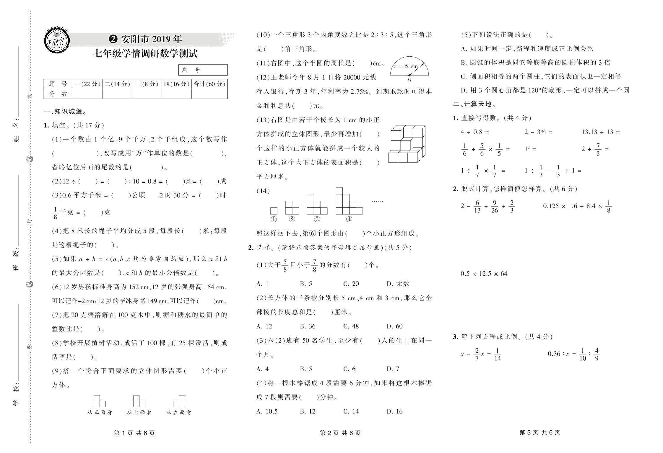 小升初数学安阳市2019年七年级学情调研数学测试【2】