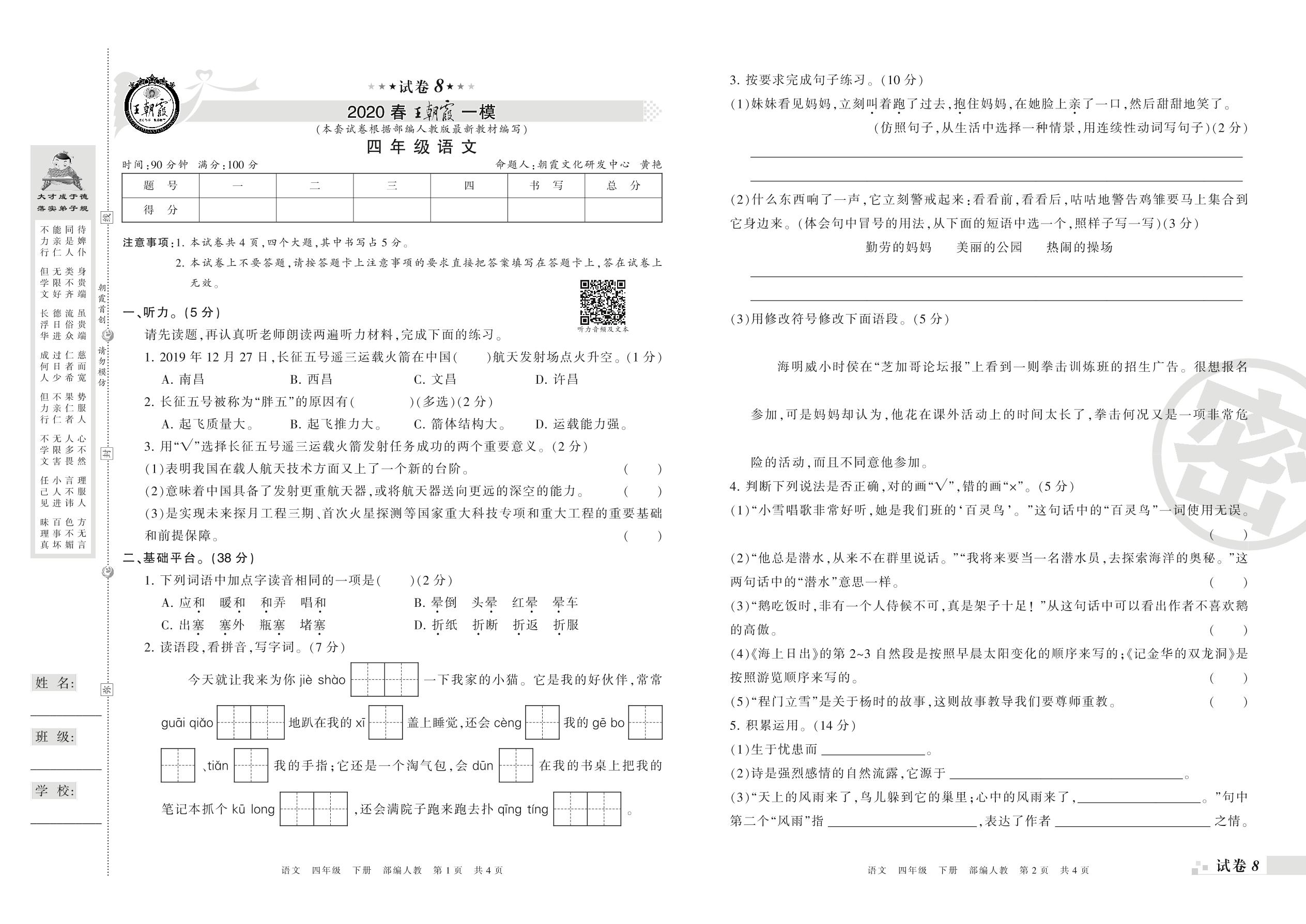 王朝霞期末模拟卷四年级下册语文(人教版)_R210801192642【8】