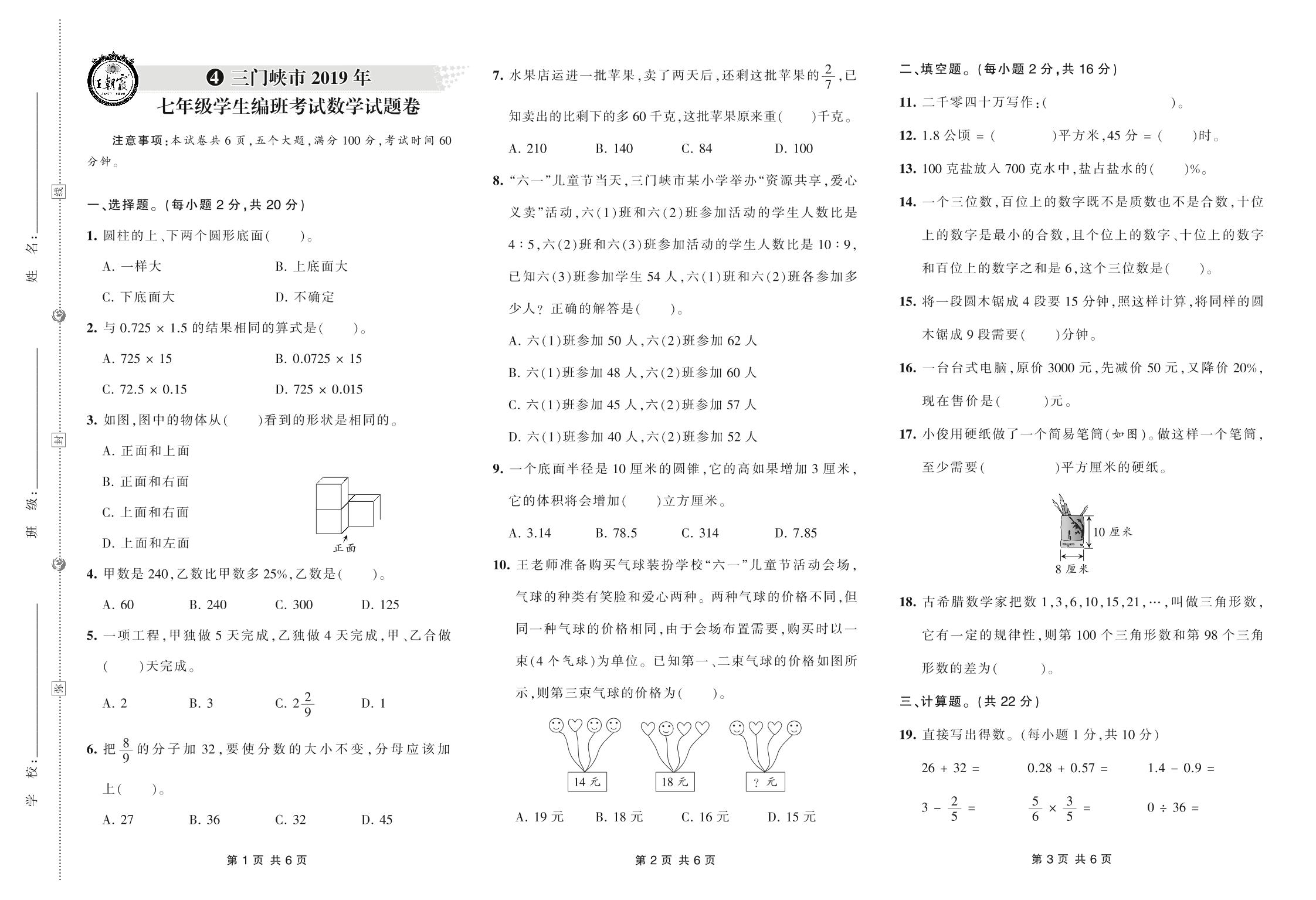 小升初数学三门峡市2019年七年级学生编班考试数学试题卷【4】