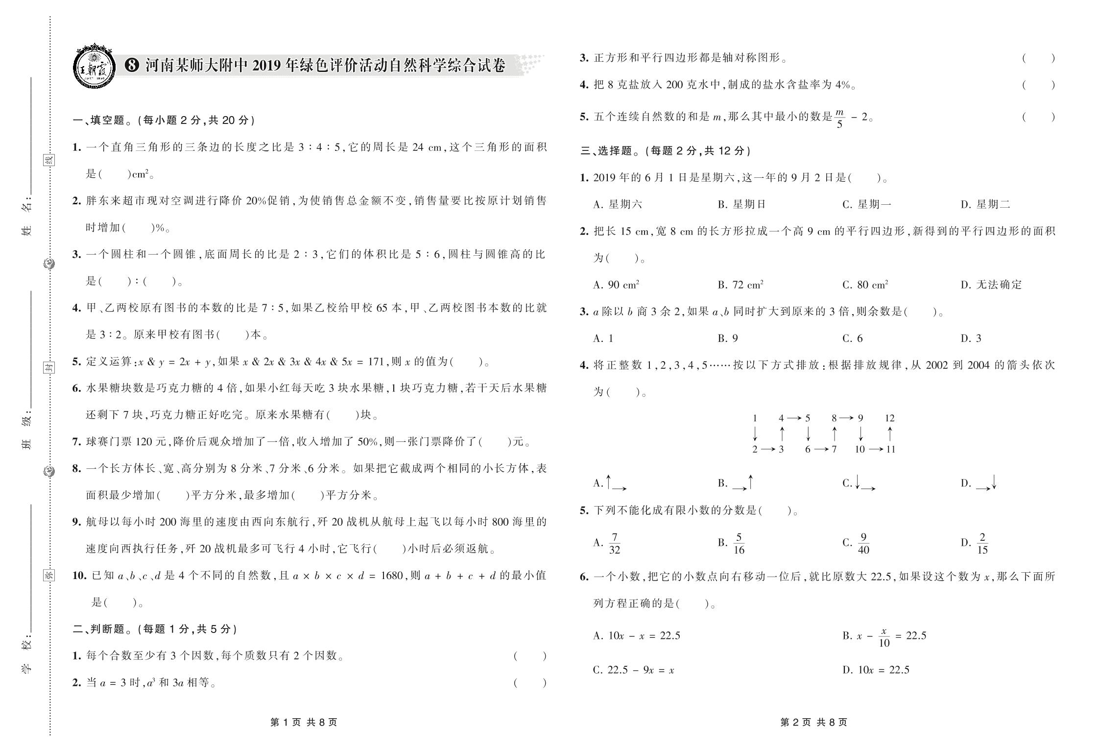 小升初数学河南某师大附中2019年绿色评价活动自然科学综合试卷【8】