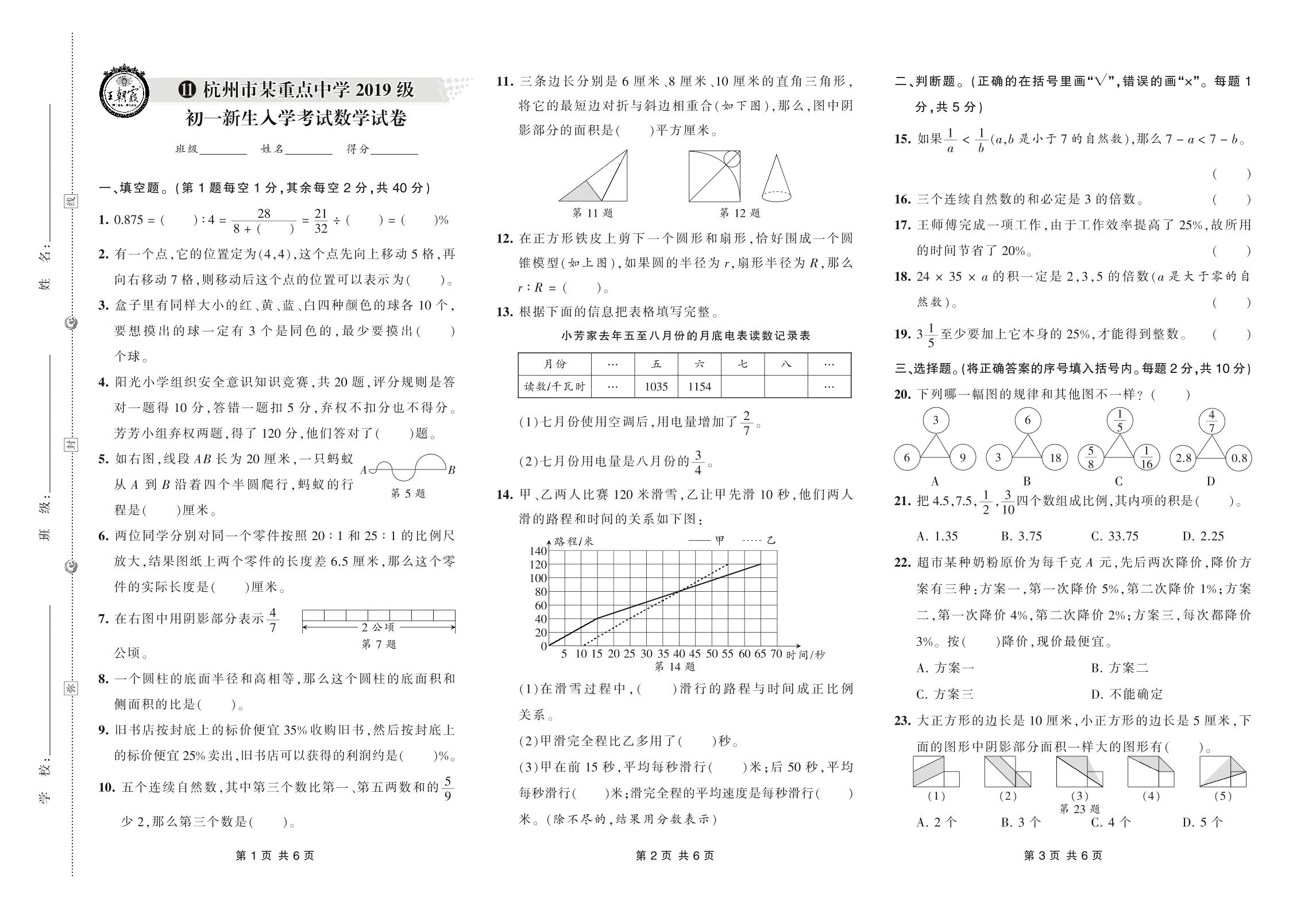 小升初数学杭州市某重点中学2019级初一新生入学考试数学试卷【11】