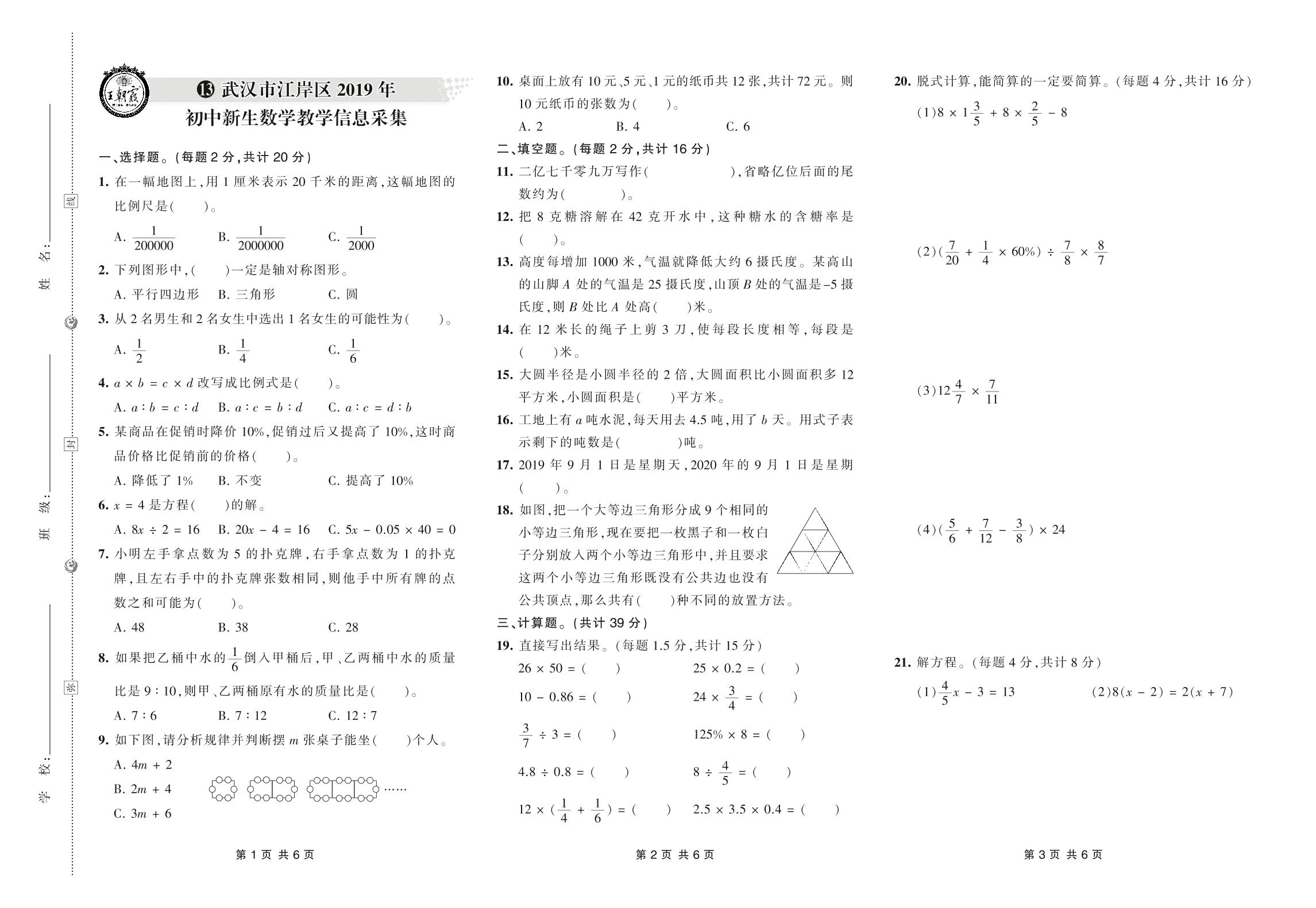 小升初数学武汉市江岸区2019年初中新生数学教学信息采集【13】