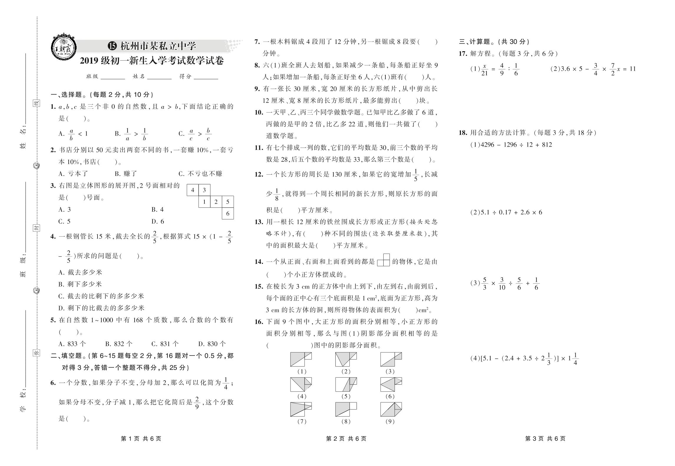 小升初数学杭州市某私立中学2019级初一新生入学考试数学试卷【15】