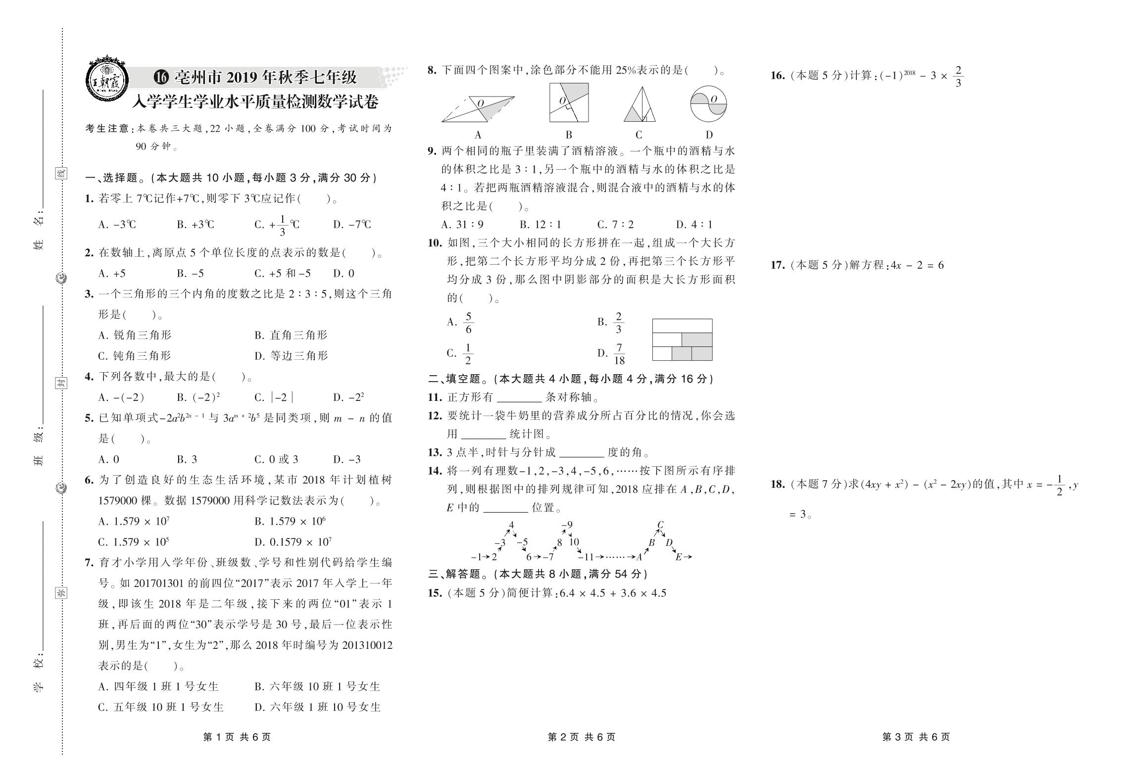 小升初数学亳州市2019年秋季七年级入学学生学业水平质量检测数学试卷【16】