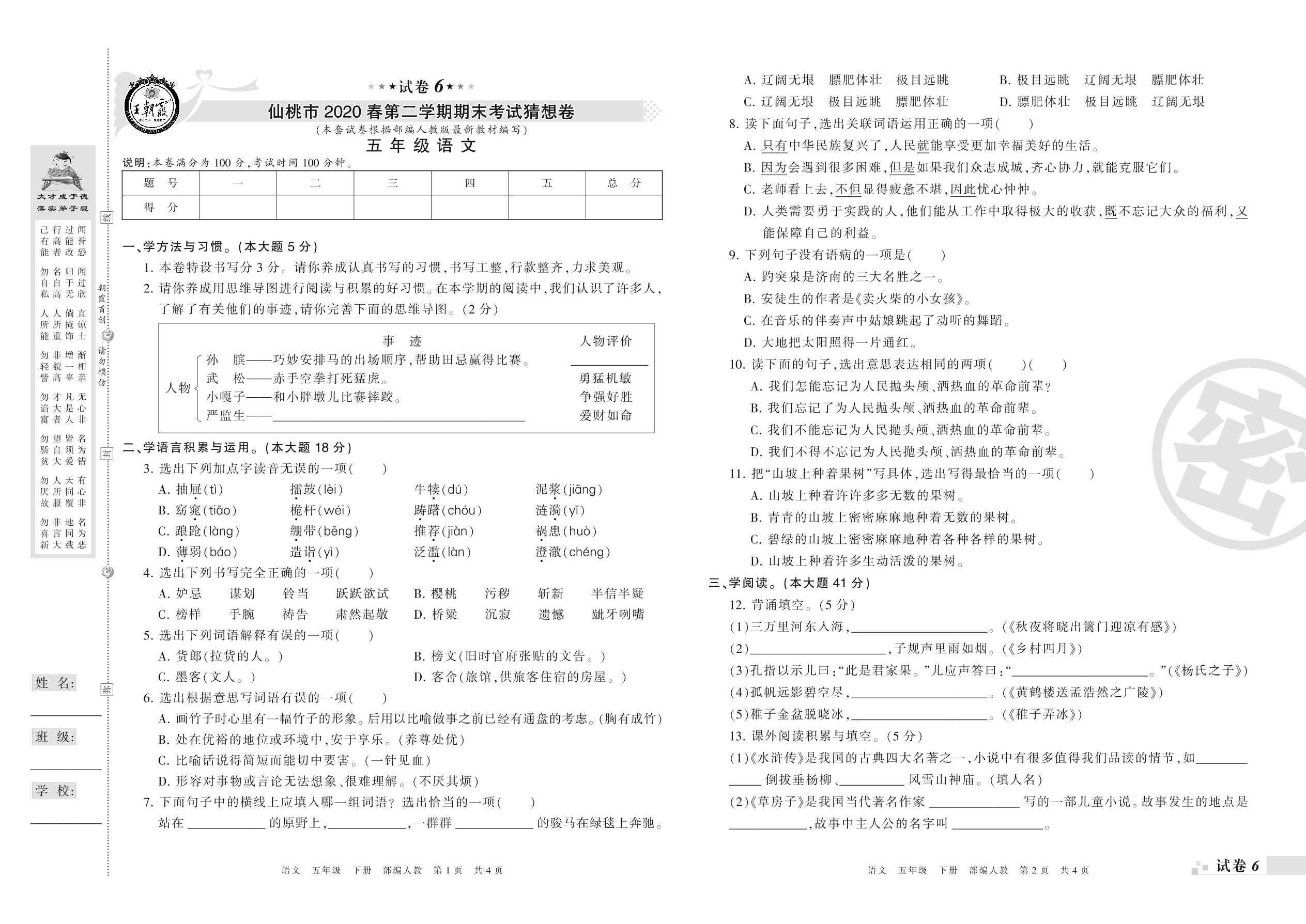 2018-2019学年第二学期仙桃市猜想卷五年级语文试卷(人教版)【6】