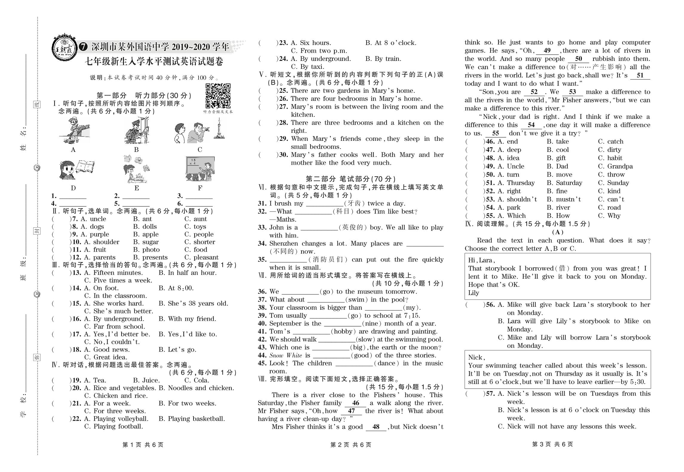 小升初英语深圳市某外国语中学2019~2020学年七年级新生入学水平测试英语试题卷【7】