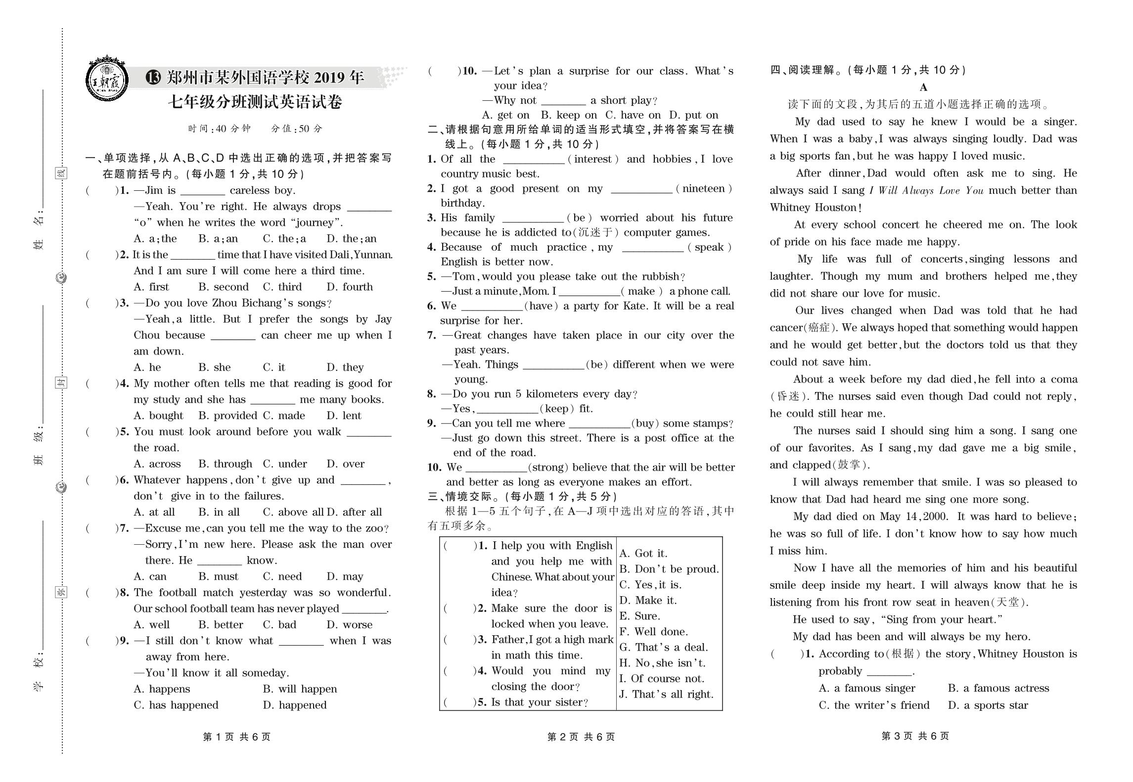 小升初英语郑州市某外国语学校2019年七年级分班测试英语试卷【13】
