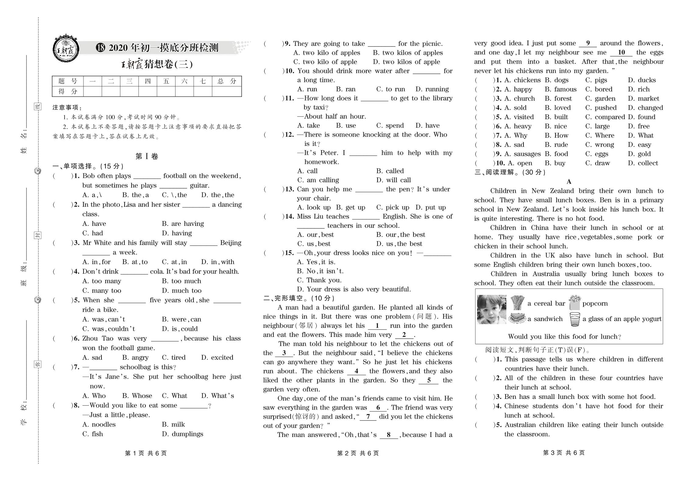 小升初英语初一摸底分班检测王朝霞猜想卷(三)【18】