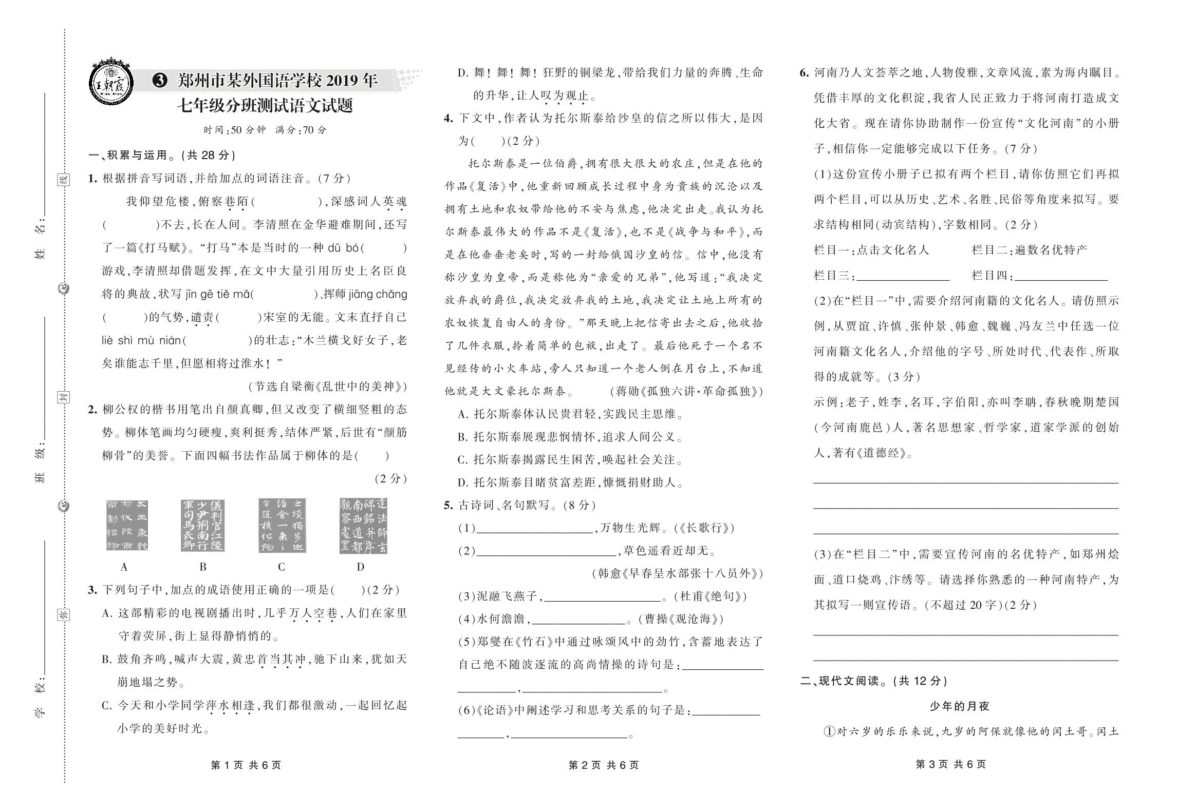 小升初语文郑州市某外国语学校2019年七年级分班测试语文试题【3】