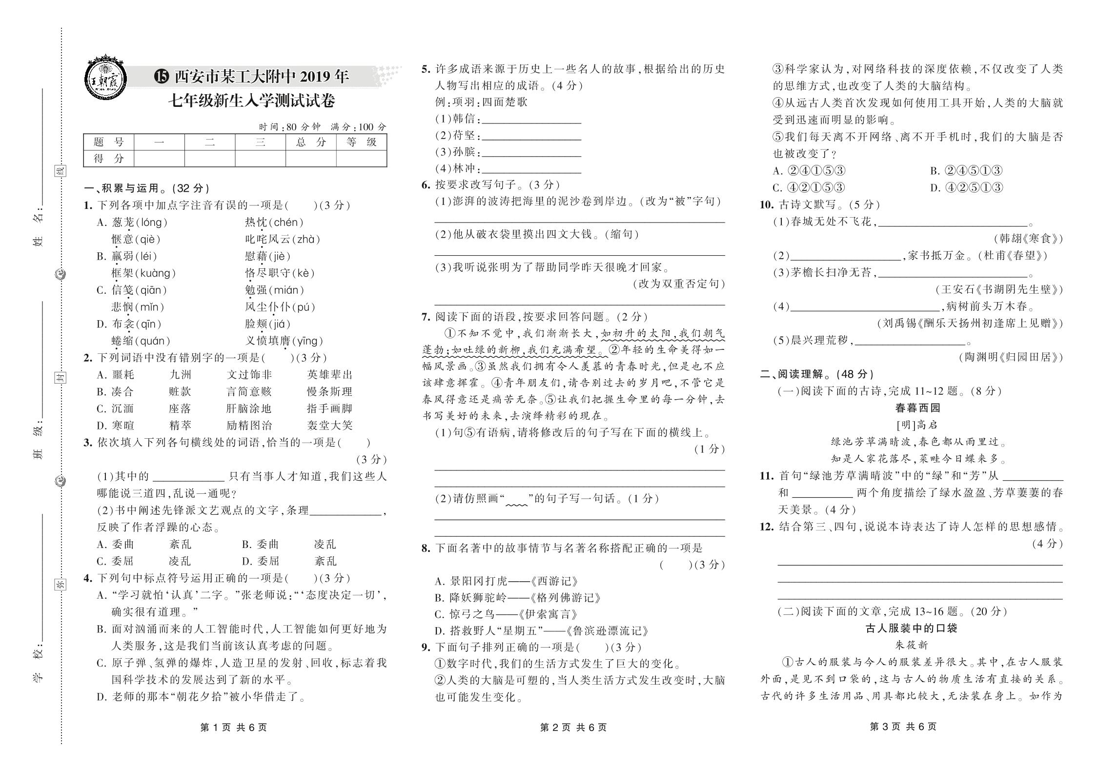 小升初语文西安市某工大附中2019年七年级新生入学测试试卷【15】