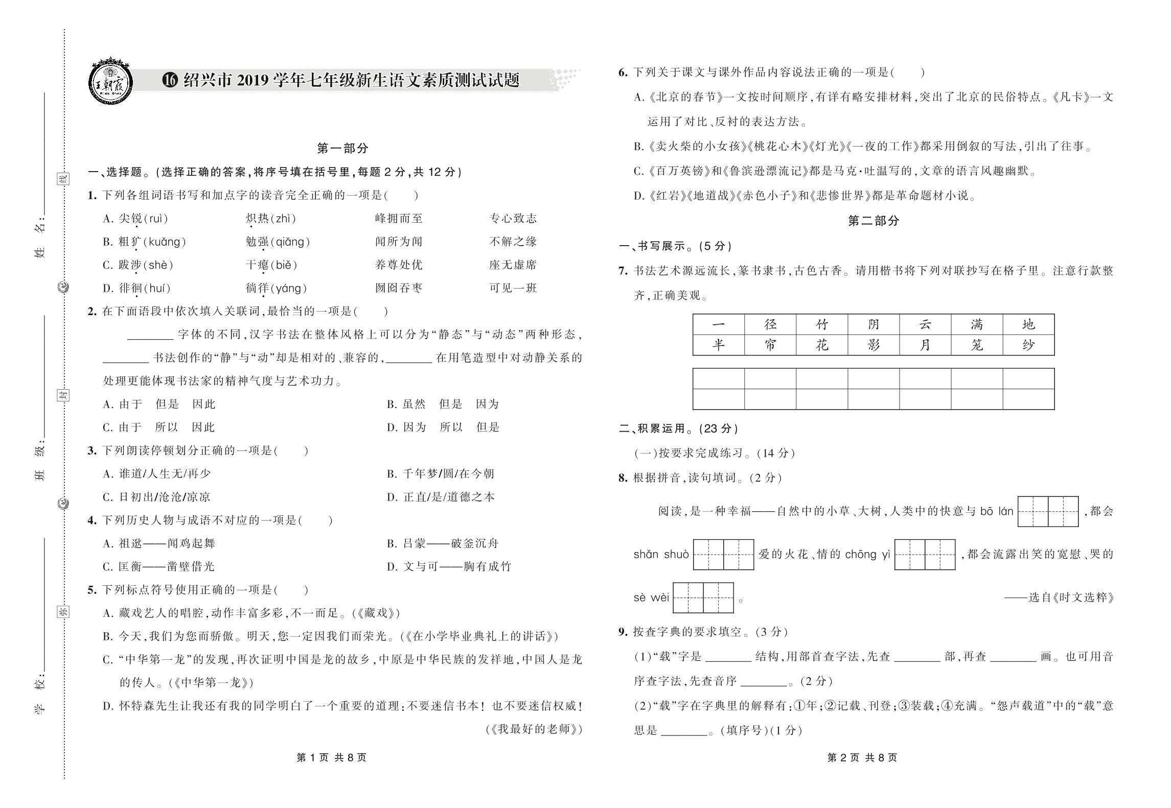 小升初语文绍兴市2019学年七年级新生语文素质测试试题【16】