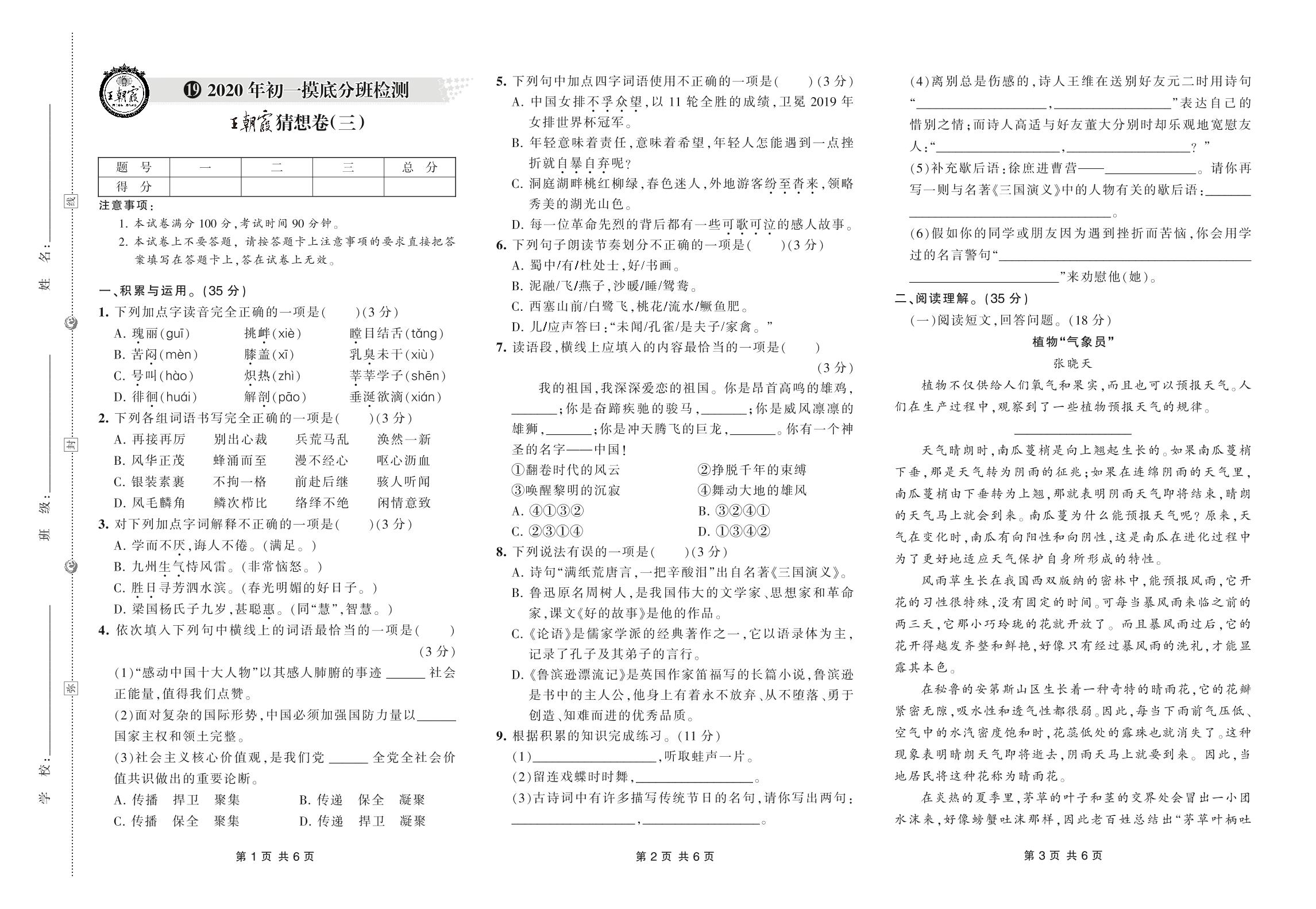 小升初语文初一摸底分班检测王朝霞猜想卷【19】