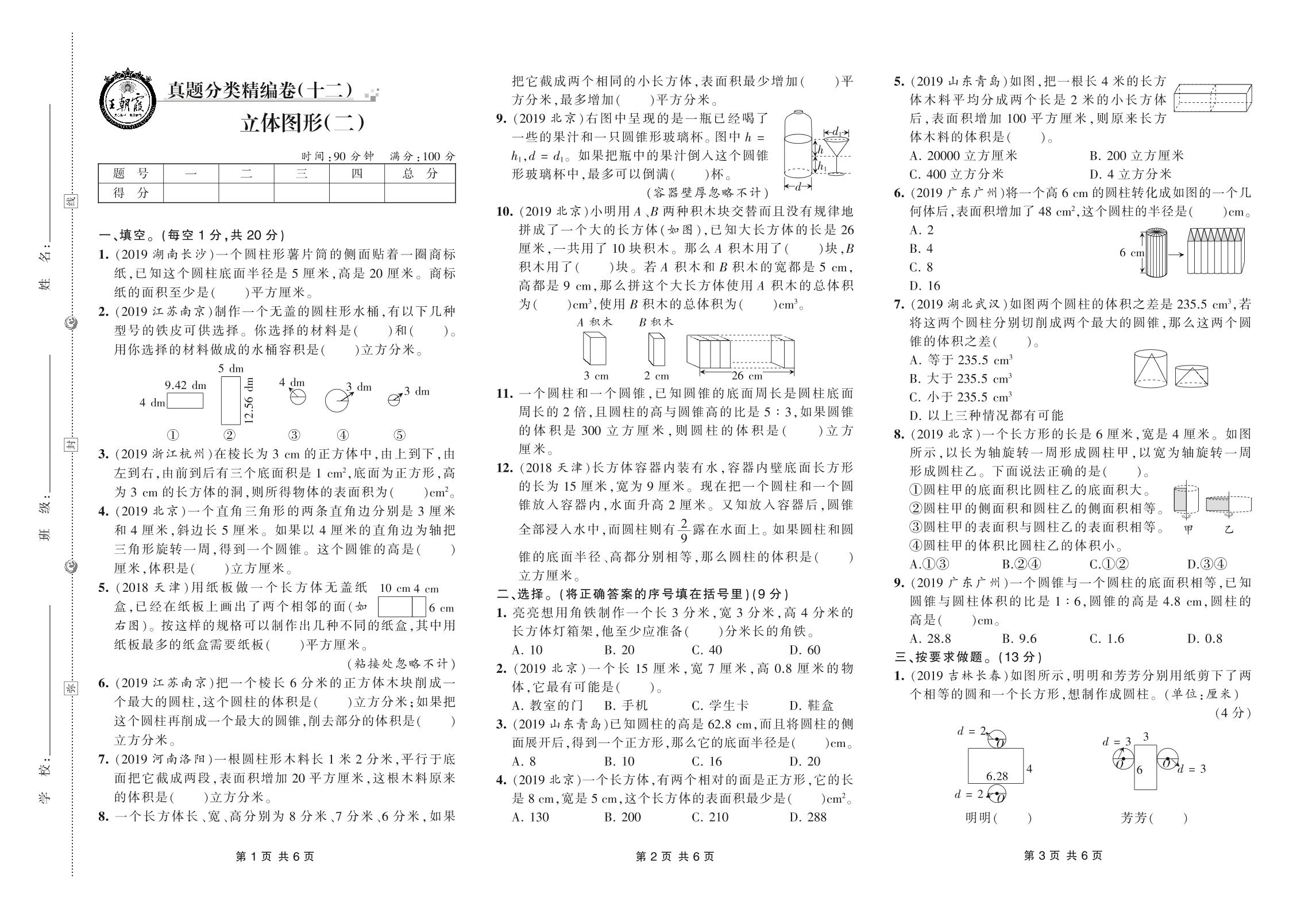 2020全一册六年级数学不分版本 小升初数学真题分类·王朝霞精编卷——立体图形(二)【12】