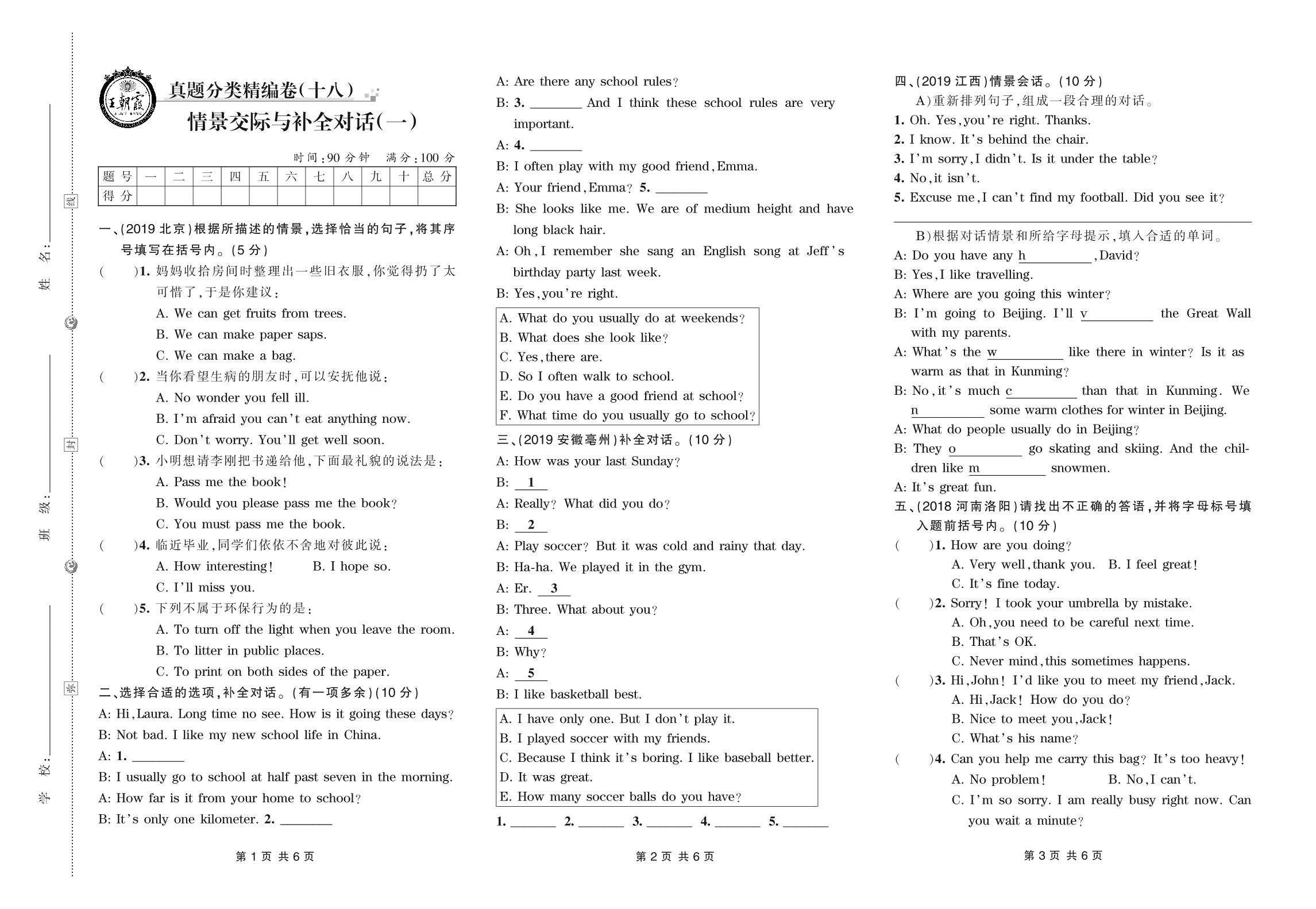 小升初英语真题分类·王朝霞精编卷——情景交际与补全对话(一)【18】
