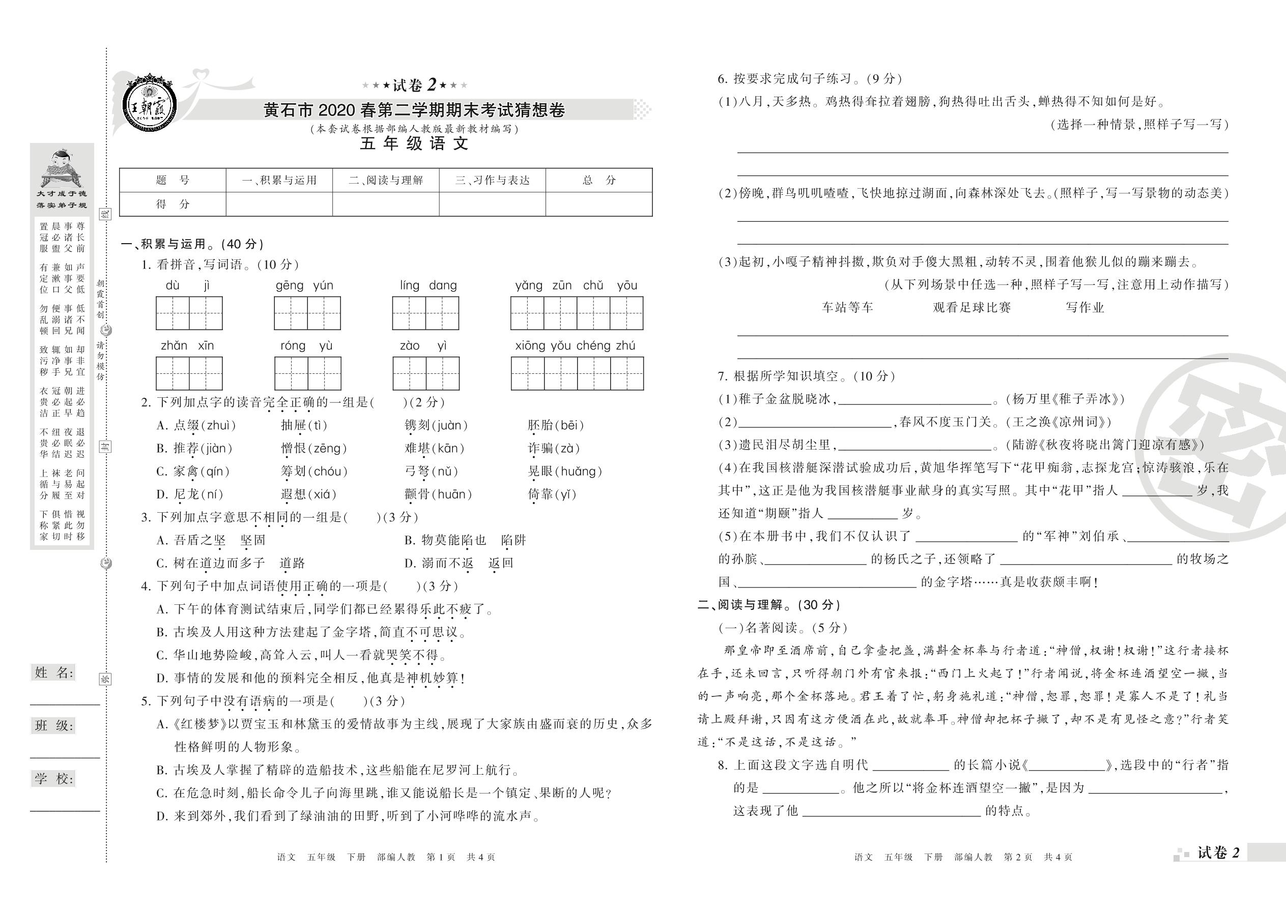 2018-2019学年第二学期黄石市猜想卷五年级语文试卷(人教版)【2】