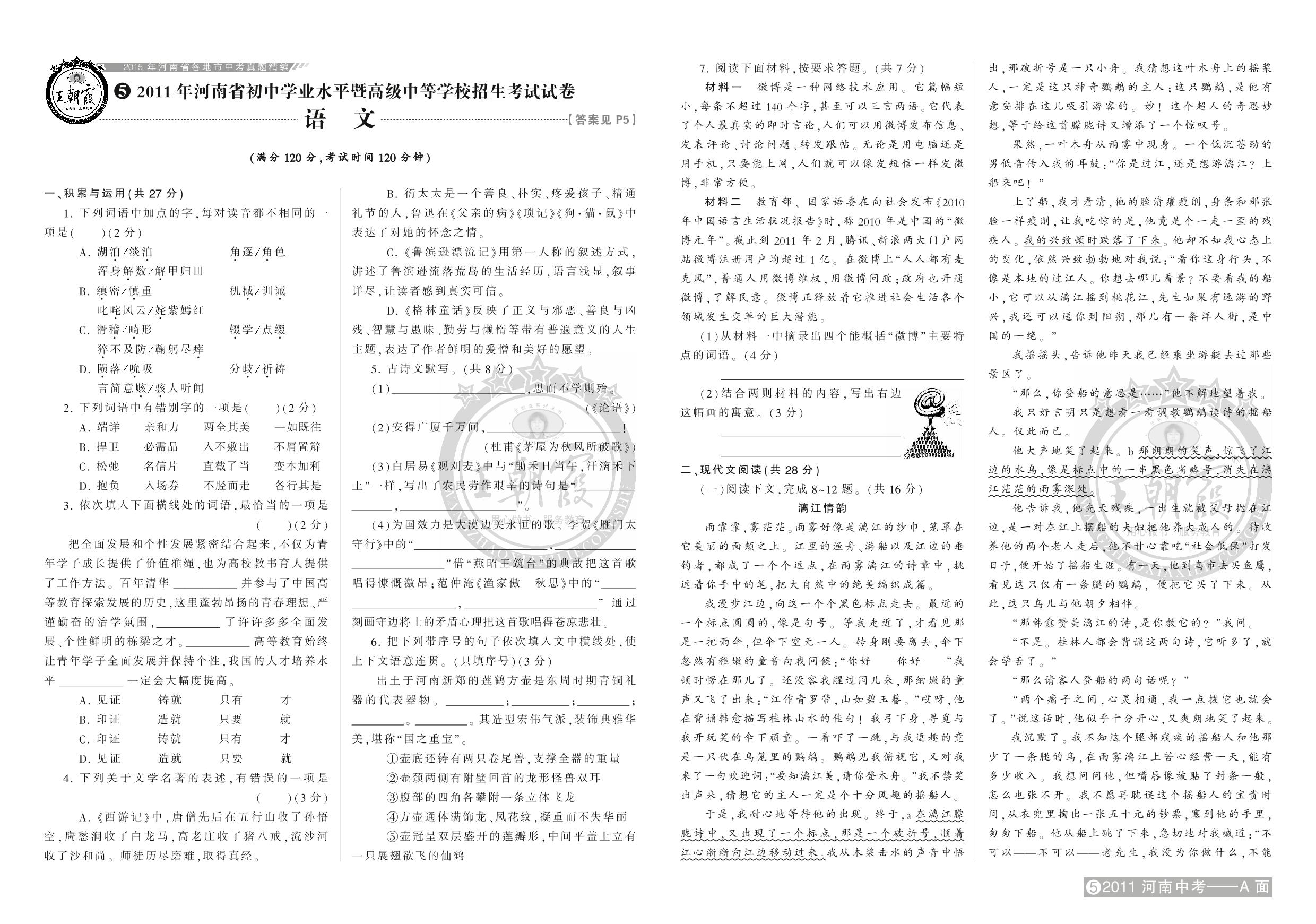 2011年河南省初中学业水平暨高级中等学校招生考试试卷【5】