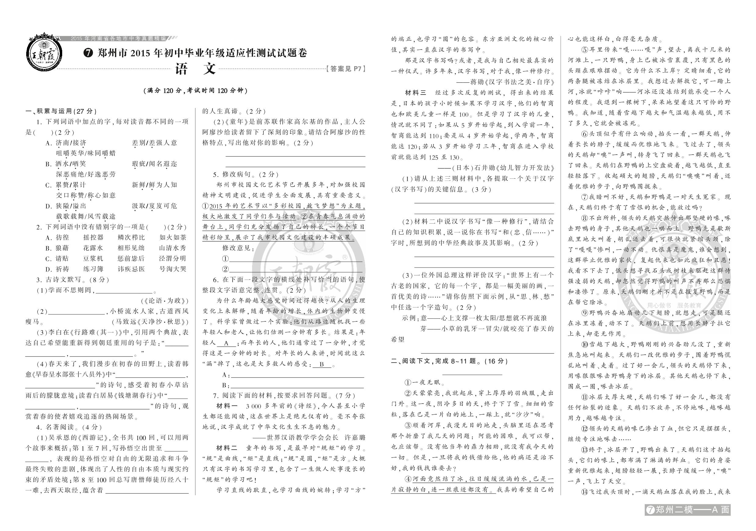 郑州市2015年初中毕业年级适应性测试试题卷【7】