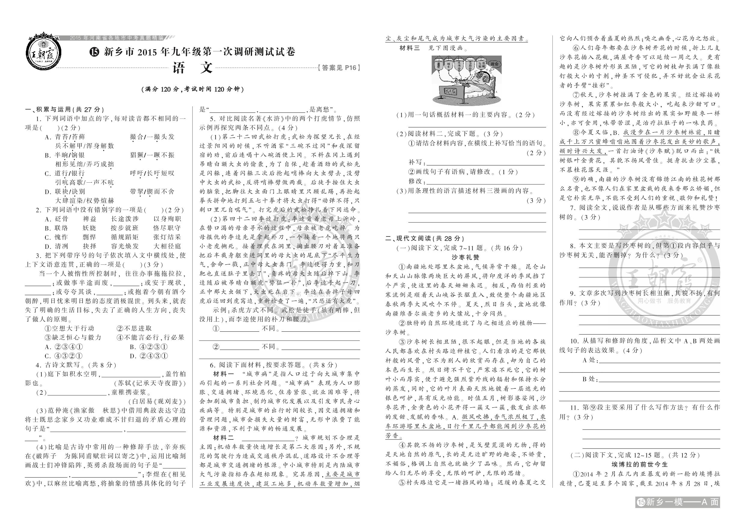 新乡市2015年九年级第一次调研测试试卷【15】
