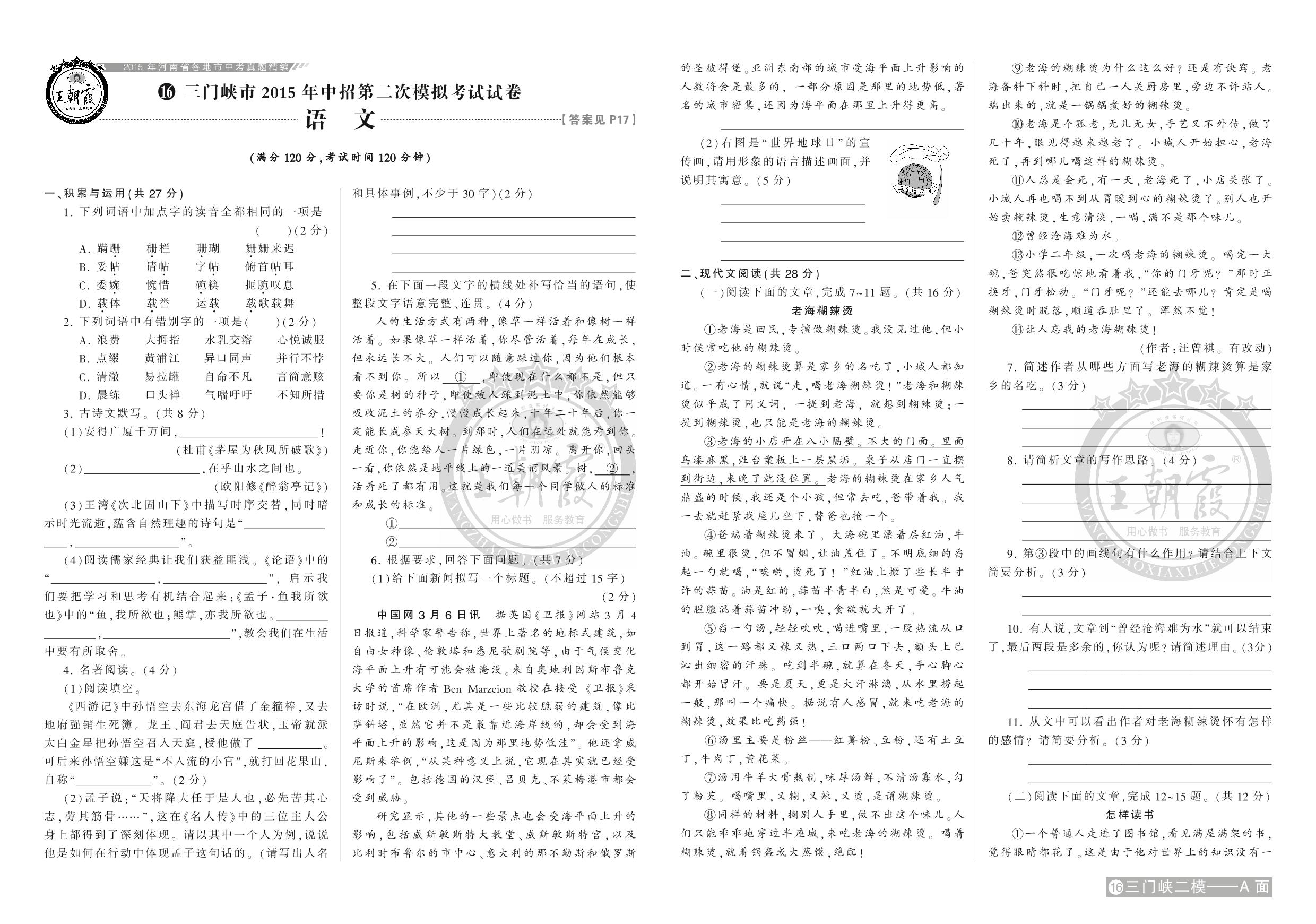 三门峡市2015年中招第二次模拟考试试卷【16】