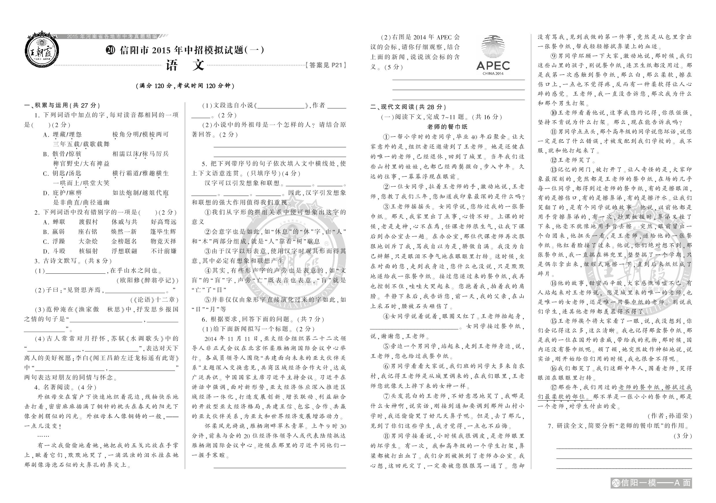 信阳市2015年中招模拟试题(一)【20】