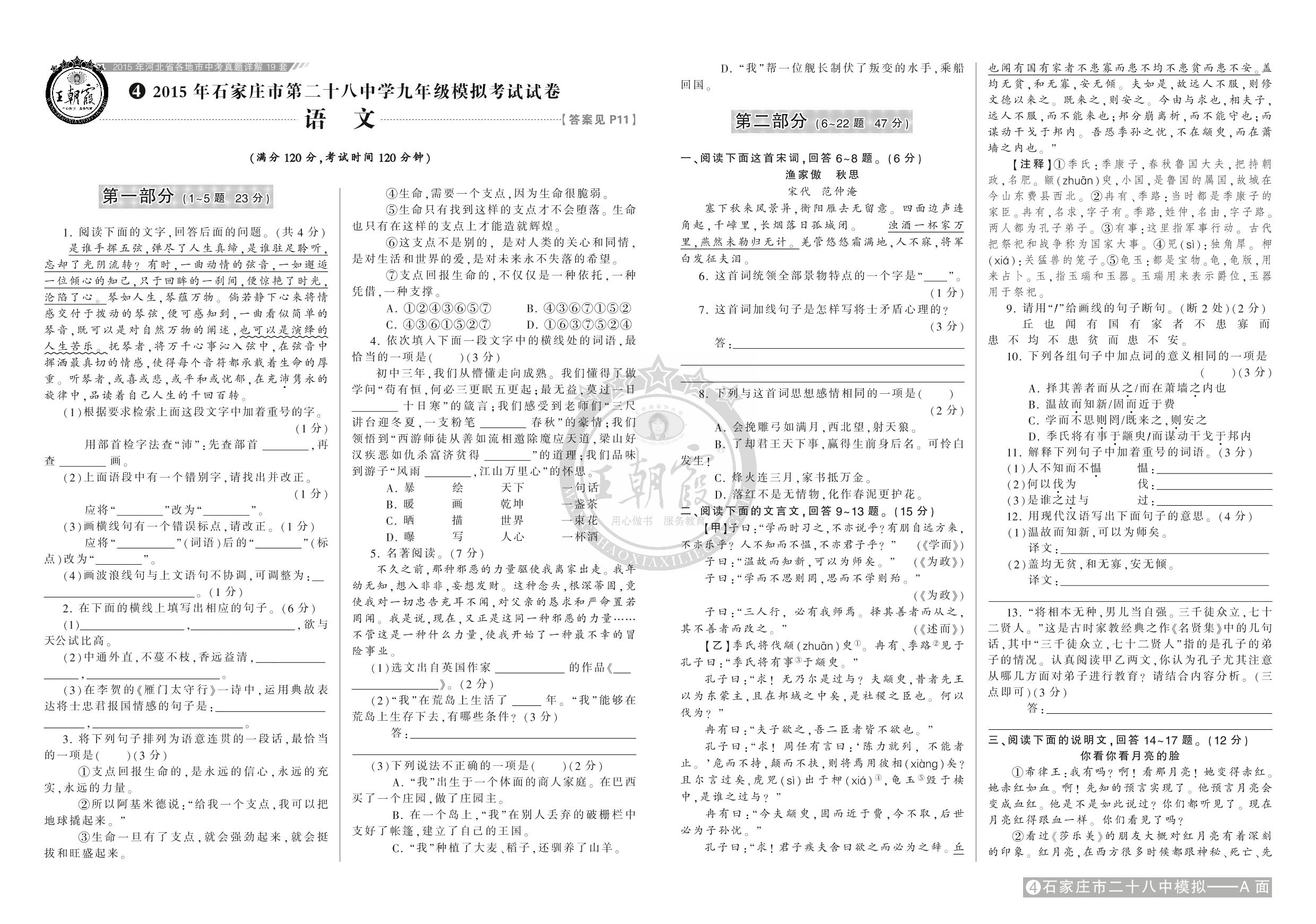 石家庄市第二十八中学九年级模拟考试试卷【4】
